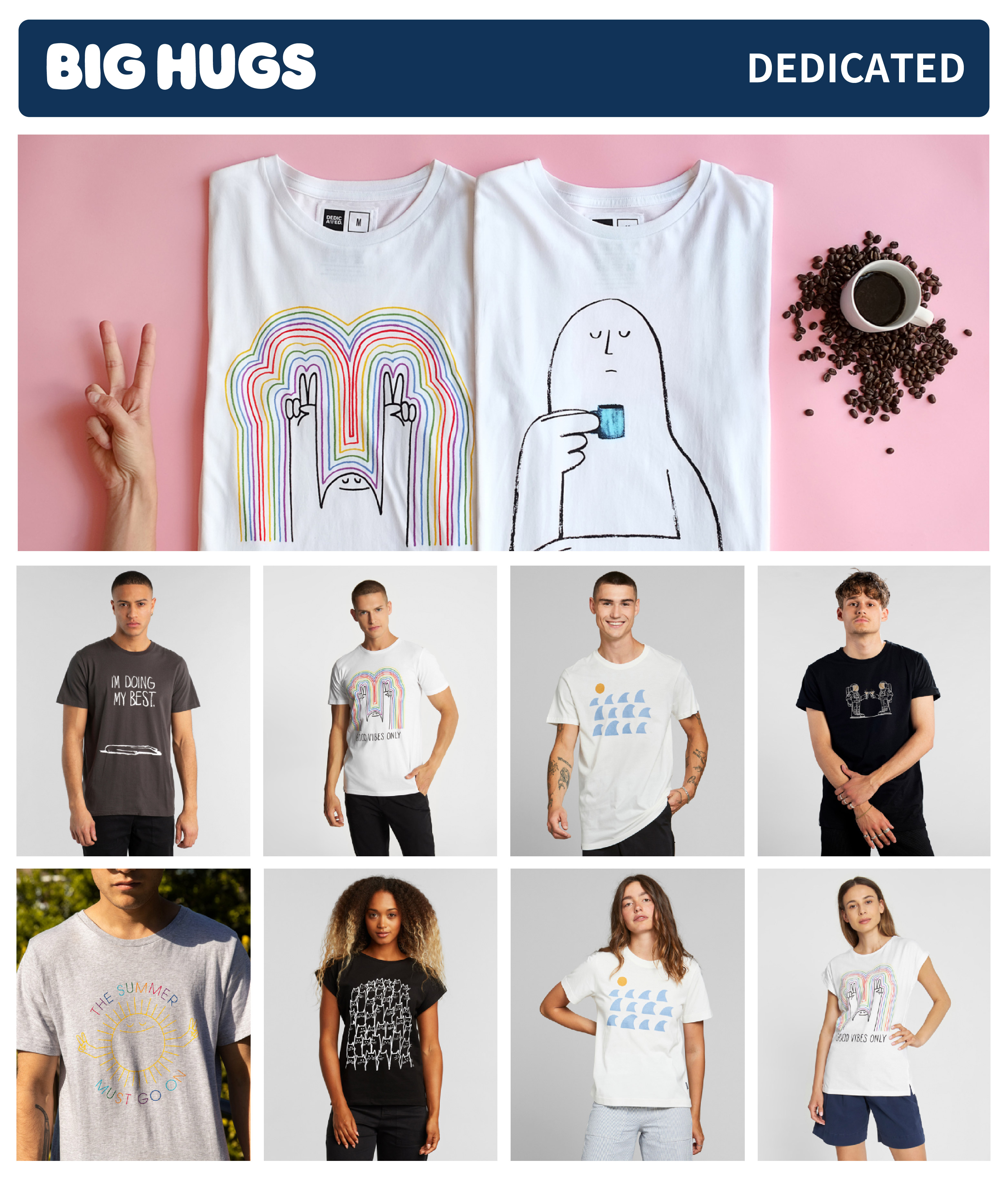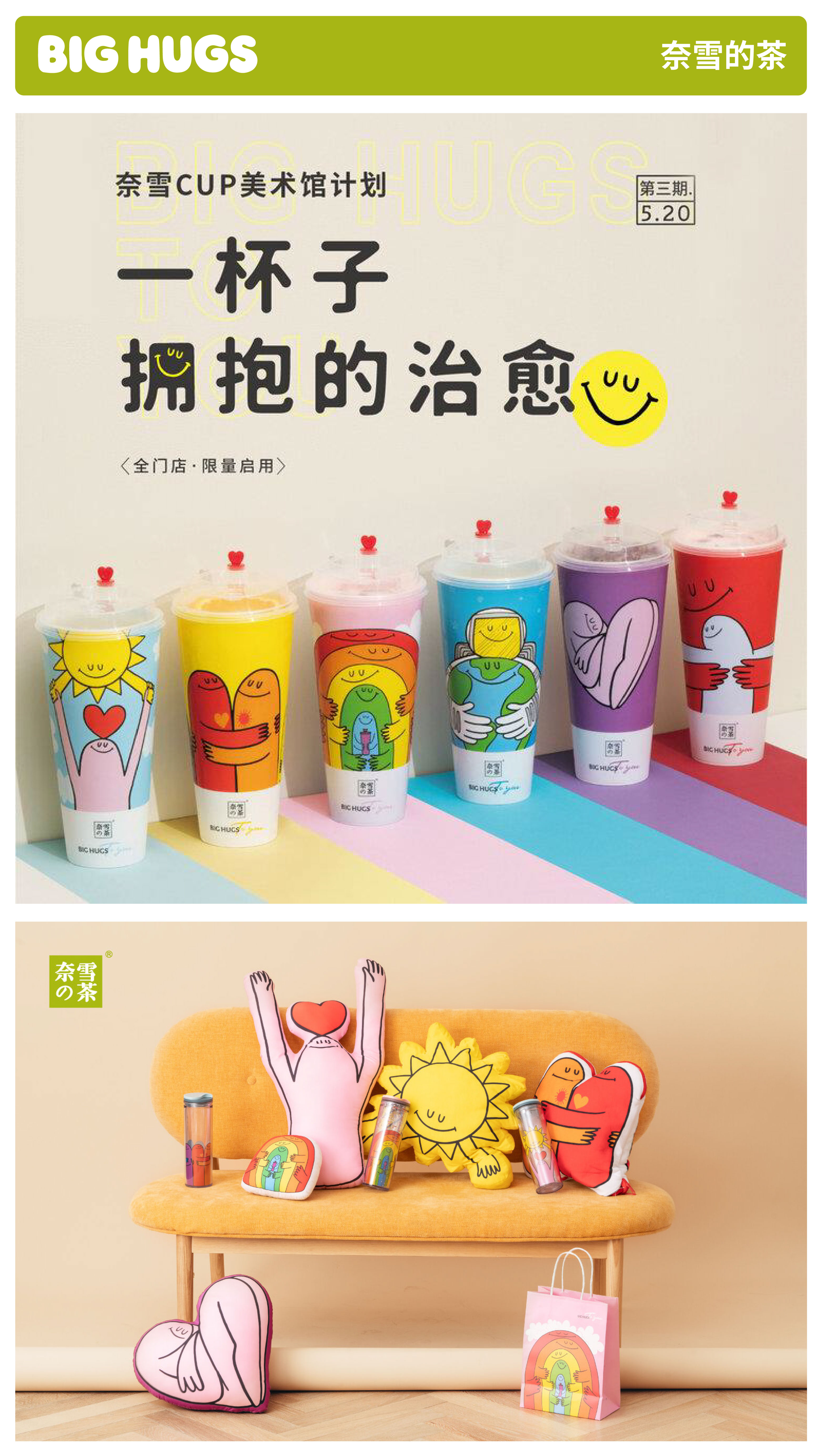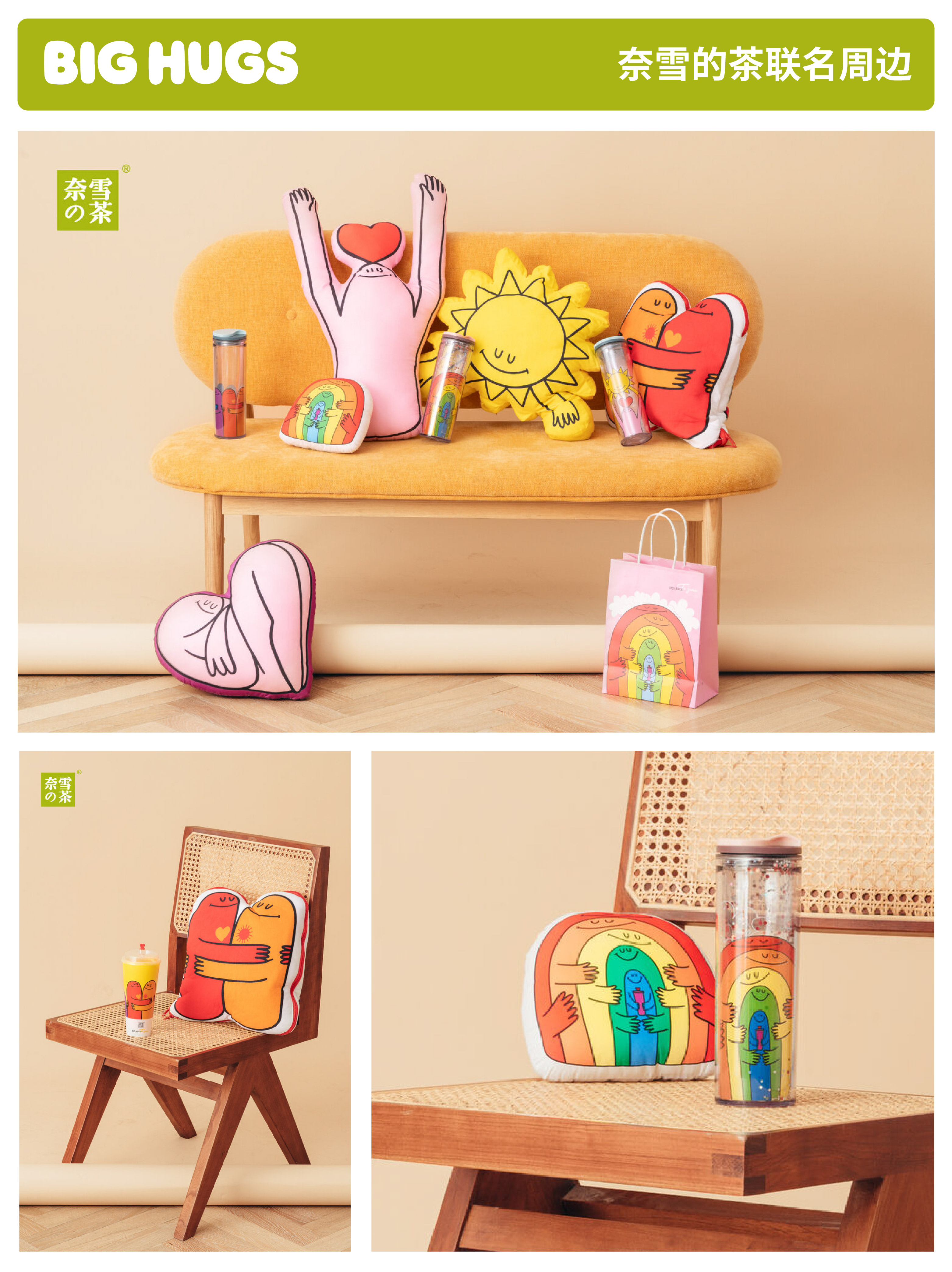 Big Hugs抱抱独具特色,色彩缤纷、设计极简,散发出阳光和幽默的氛围!我们以直观通俗的形式赋予品牌时尚流行的当代艺术特质,赢得了年轻消费者的狂热喜爱!正因如此,我们备受优衣库、Nike、奈雪、COACH、PANDORA等全球知名品牌的青睐与推崇!