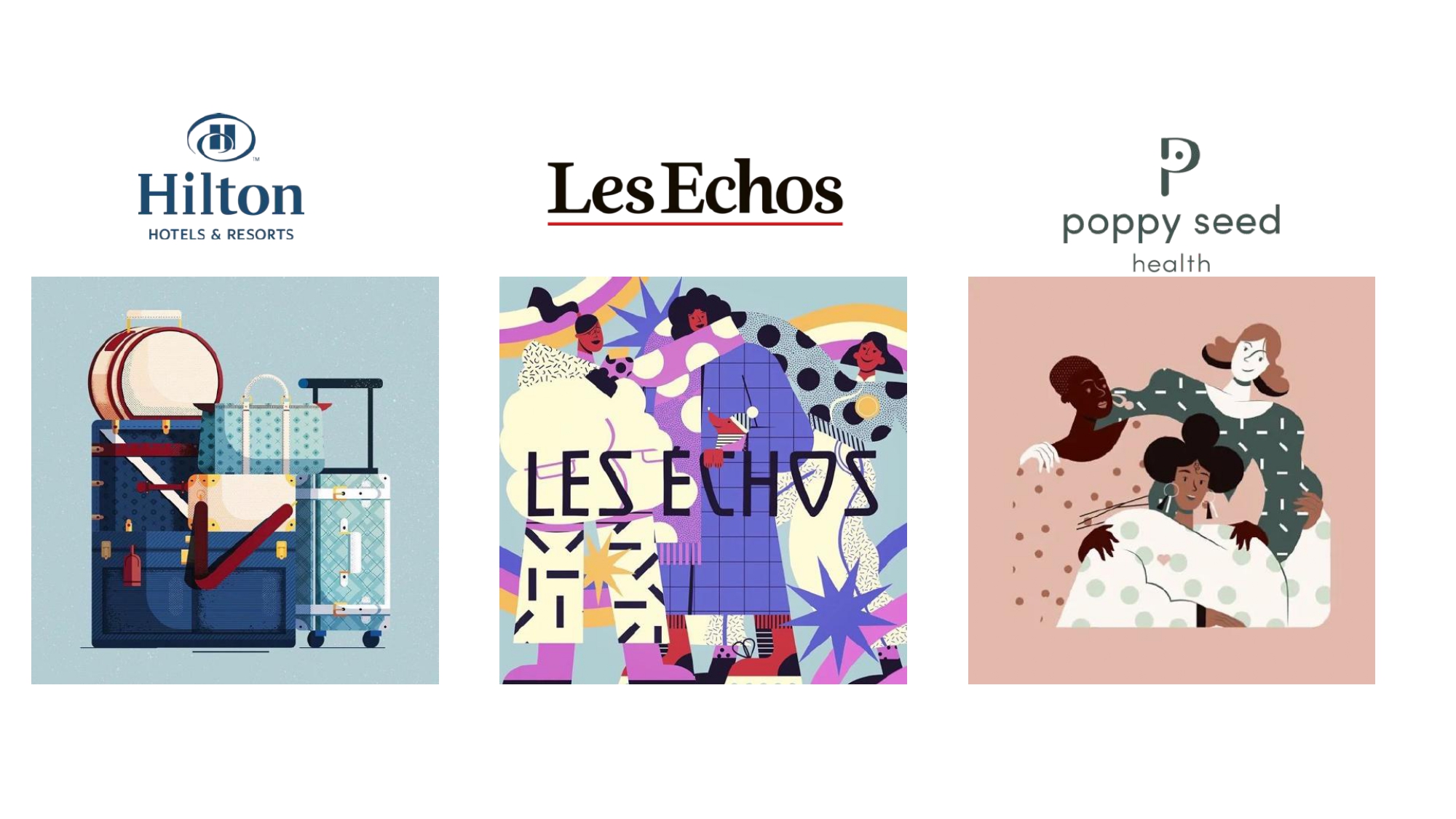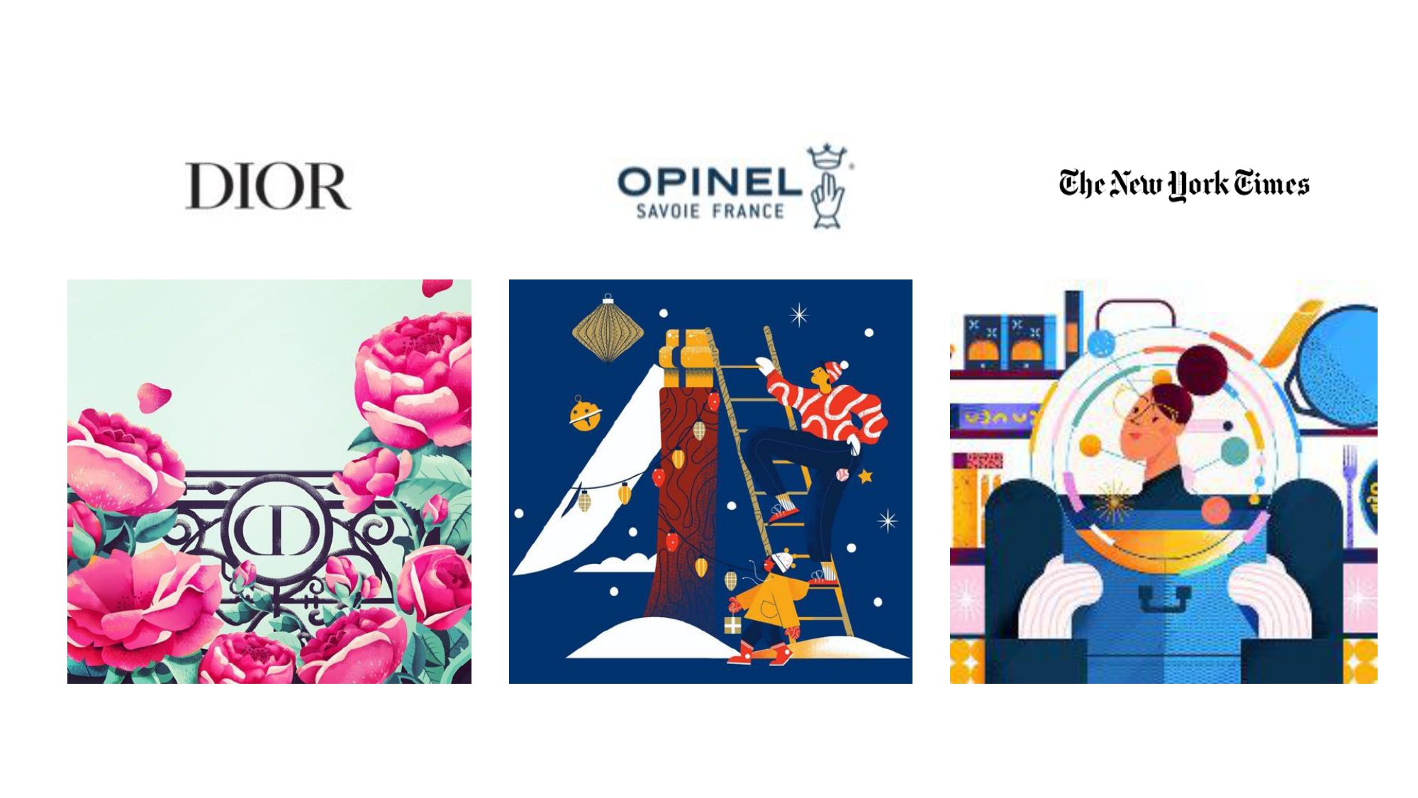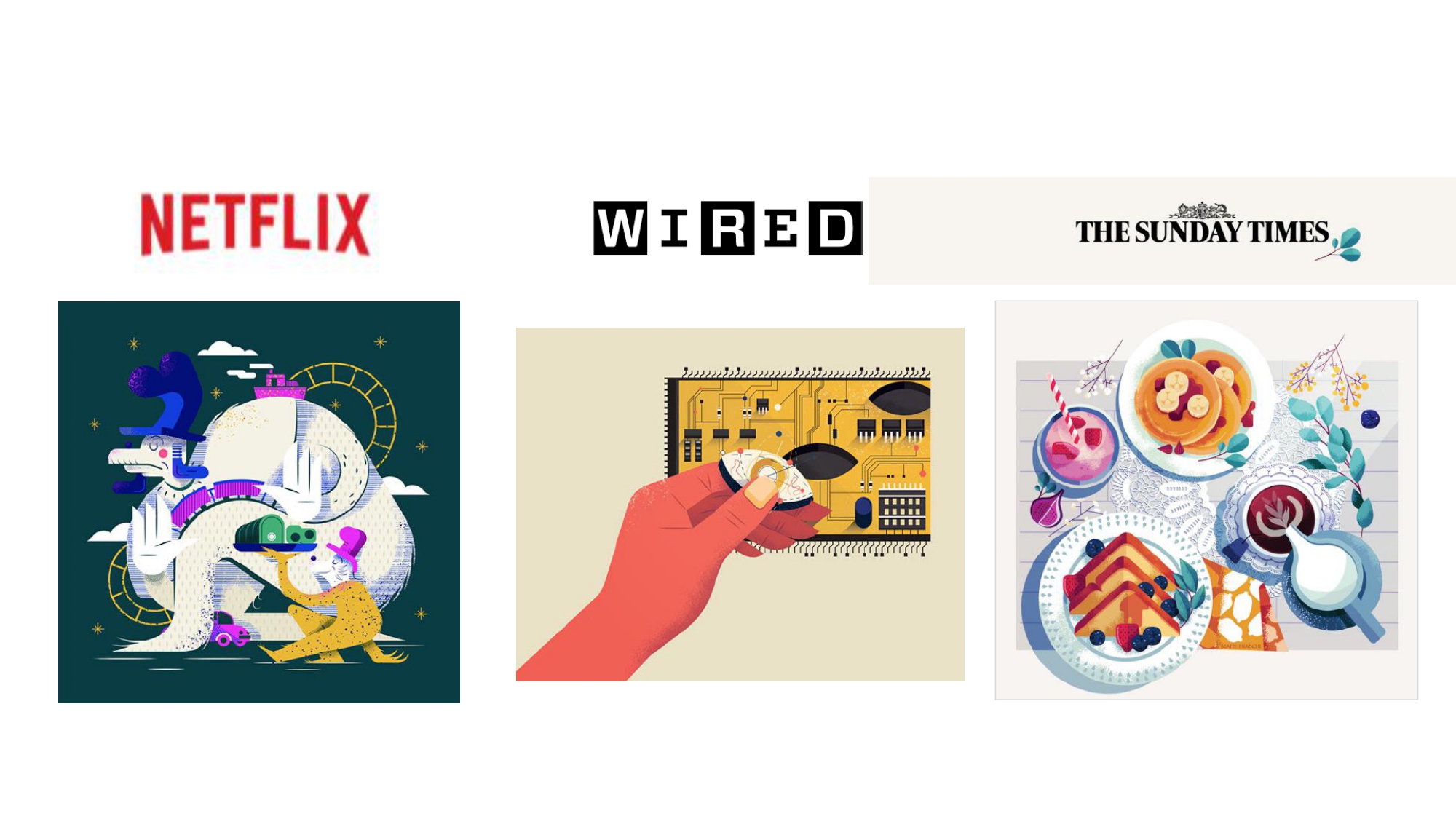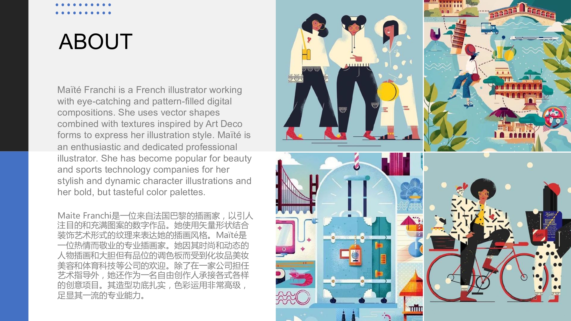 Maïté Franchi 只需几条线条和颜色就可以传达如此多的东西。她受到她巴黎家的装饰形式和纹理的启发,但她认为自己是各种流派和风格综合的学生。Maïté 作为艺术总监、插画家和平面设计师拥有丰富的经验,为她的客户带来了独特的技能。客户包括了:Adobe、可口可乐、索尼、迪奥、娇兰 、微软、EasyJet、路虎、名利场、Netflix、华尔街日报、BETC、欧洲之星、Badoit、雀巢、Fubiz、LeParisien 、 BNP、 赫芬顿邮报、 伦敦葡萄酒博览会,道达尔、英国石油、Sixt、皇家邮政、 商店杂志、福布斯 、电讯报 、时代、造型师、BBC 焦点杂志、连线、欧莱雅、欧洲之星、Go Ahead Tours、伦敦葡萄酒展、Les Echos、公告杂志