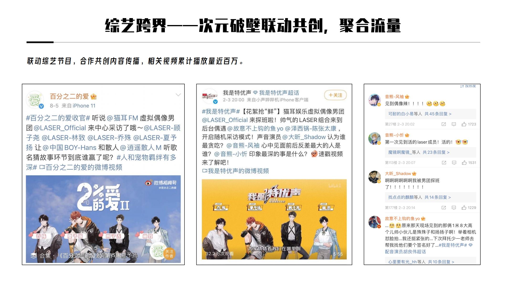 猫耳娱乐是猫耳FM旗下的偶像经纪品牌,旗下有众多虚拟偶像艺人,包括虚拟偶像LASER_Official。该品牌主打声优+音乐相结合的男团企划,借助猫耳FM垂直且超强粉丝粘性的平台,不断探索声创虚拟偶像边界。并于2020年推出首个声控向全C位虚拟男团-LASER。