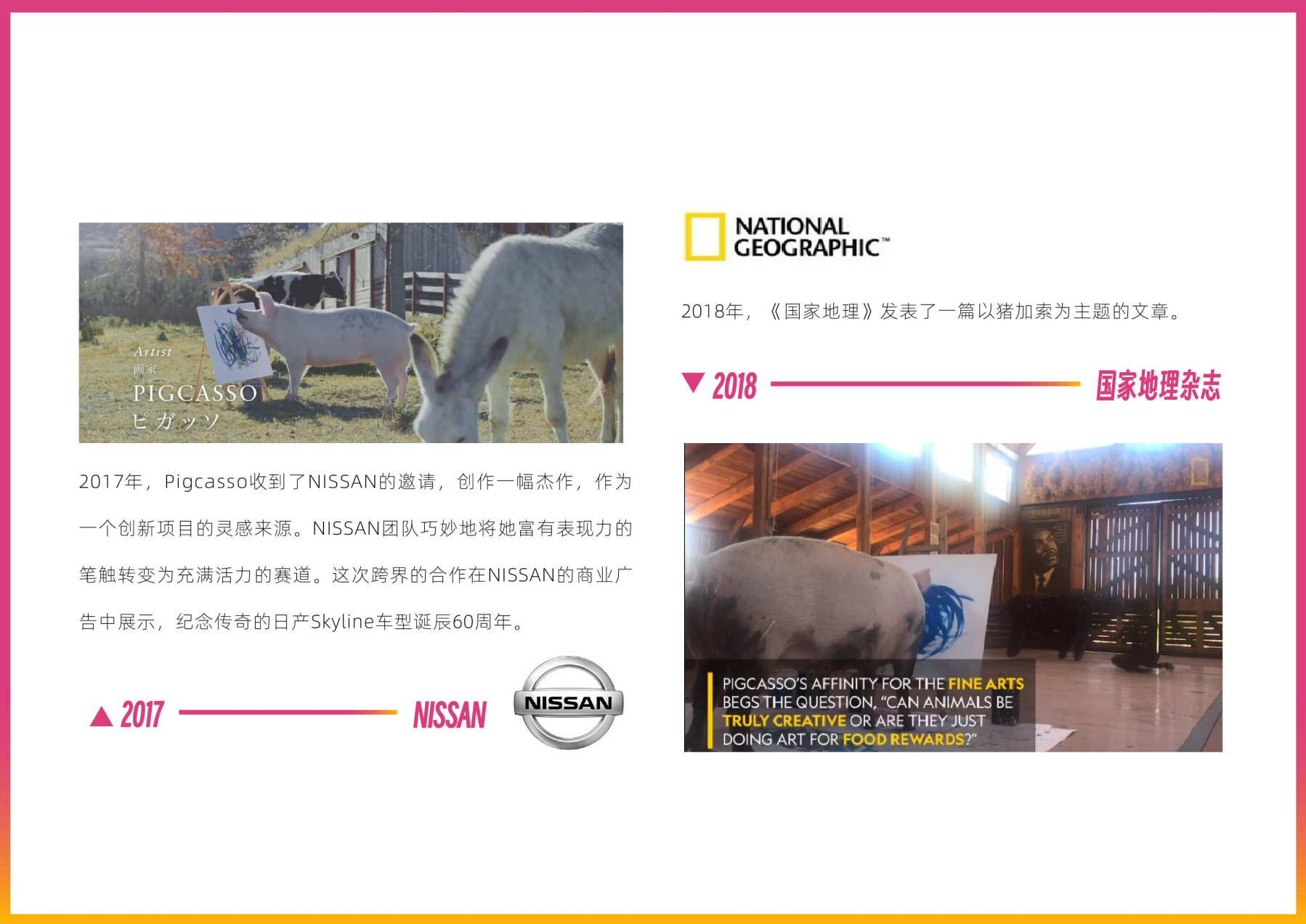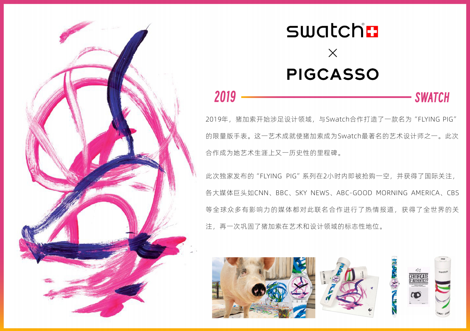 我们的IP是一只会画画的猪,曾经和Swatch手表有过深度合作,联名产品在2小时内被抢空,之前还有过一副画作《狂野与自由》卖出了20000英镑(超过了17万人民币)的价格,这一成交打破了“动物创作最昂贵绘画品”的吉尼斯世界记录。近几年更是在各大国家举办非人类艺术家画展,由于这个IP的独特性和艺术价值,世界各大媒体纷纷将其报道在头版,从而让猪加索打开了知名度。