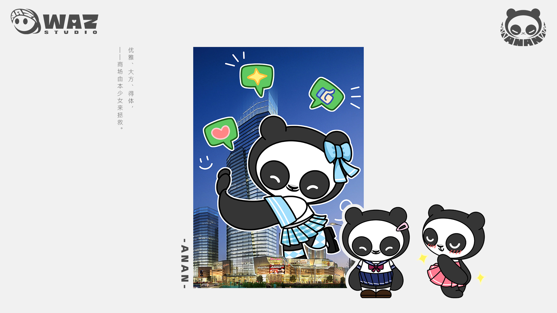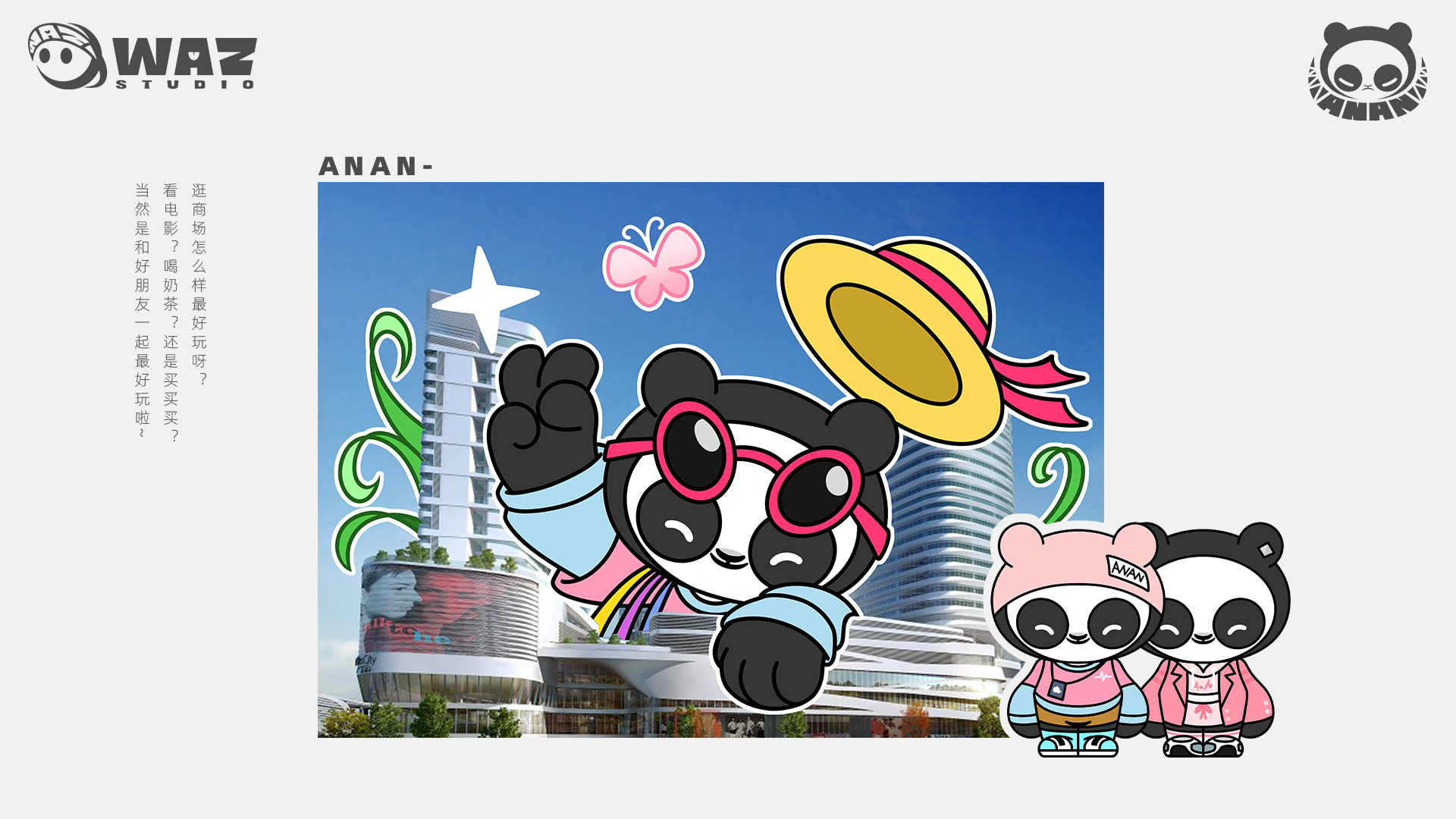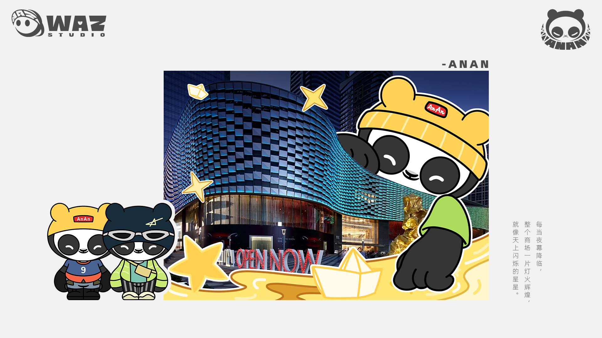 安安ANAN是一只喜爱潮流文化和时尚元素的大熊猫,Ta的造型圆圆胖胖,让人有想要与他拥抱的冲动~但熊猫不可貌相,安安憨厚的脸下,说不定隐藏着不为人知的另一面哦。安安ANAN这款潮流IP形象的特点是拥有两张面容,在憨厚的身材与脸庞下,有另一个隐秘的角落。当揭下面具露出第二张脸时,所带来的反差感正是这个IP最大的乐趣与特点之一。同时,通过不同的涂装、皮肤的演绎以及两张脸所诠释的不同意境,这让熊猫安安ANAN这个IP具有非常强的可塑性,能够良好的适配于时下流行的各个潮流行业,精准传达出各种内涵与调性。