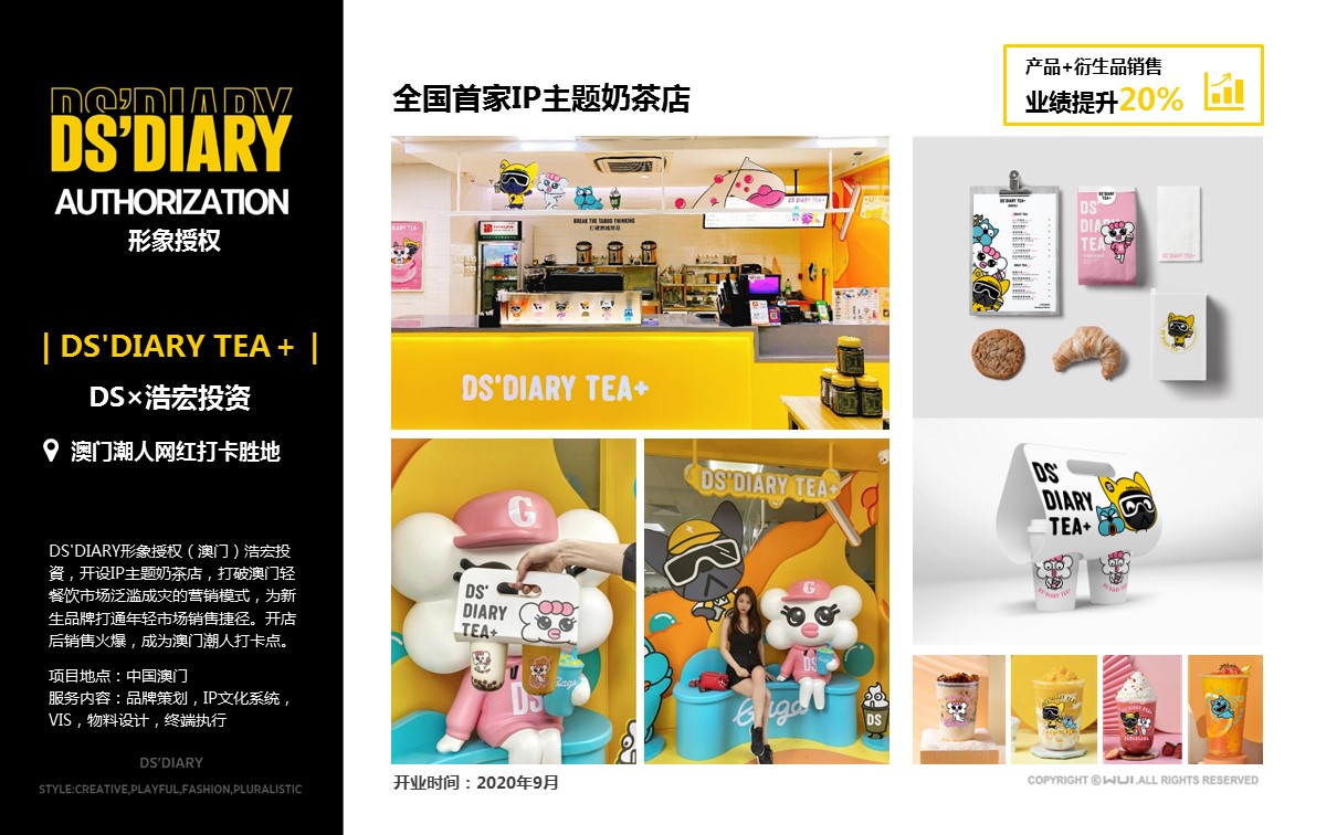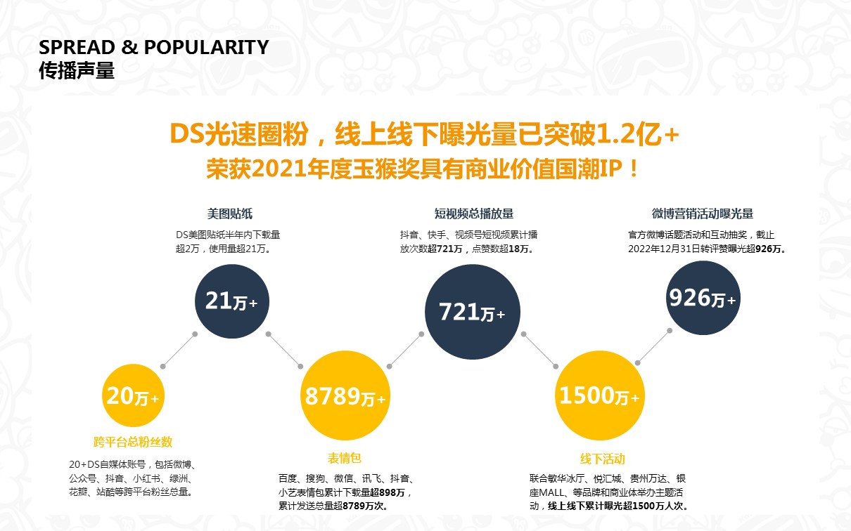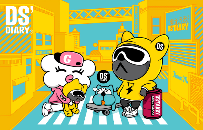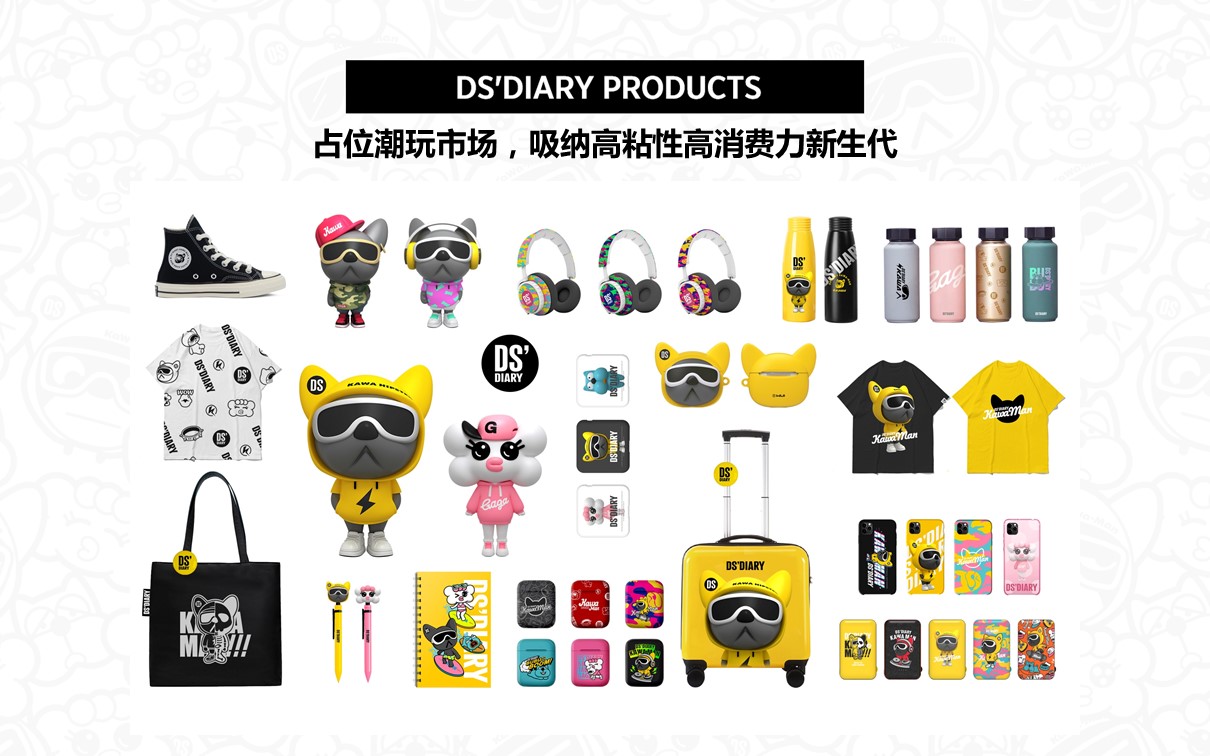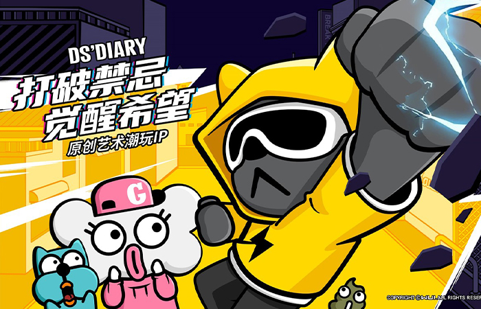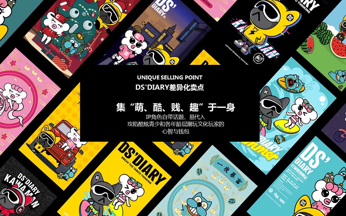 原创艺术潮玩IP【DS'DIARY狗狗日记】,2021年玉猴奖“十大最具商业价值国潮IP”。DS’专注打造代表中国Z世代的时尚国潮美学系统,宣扬“打破思维禁忌”的精神。集“萌、酷、贱、趣”于一身,家族角色自带话题属性。2021年累积曝光量超5500万。