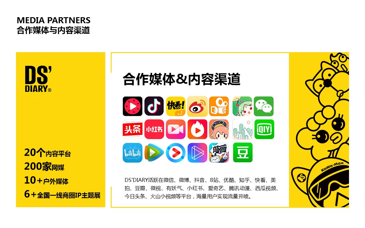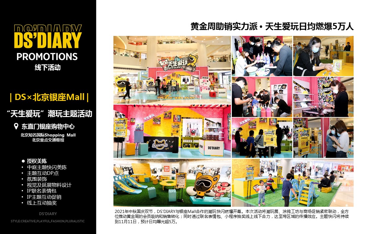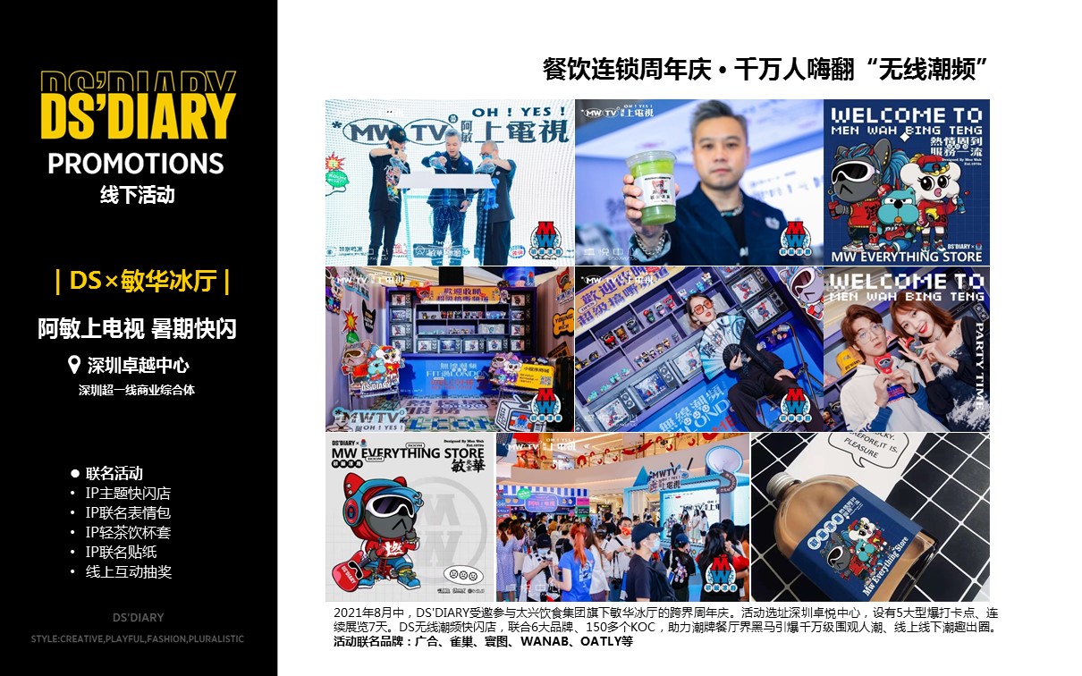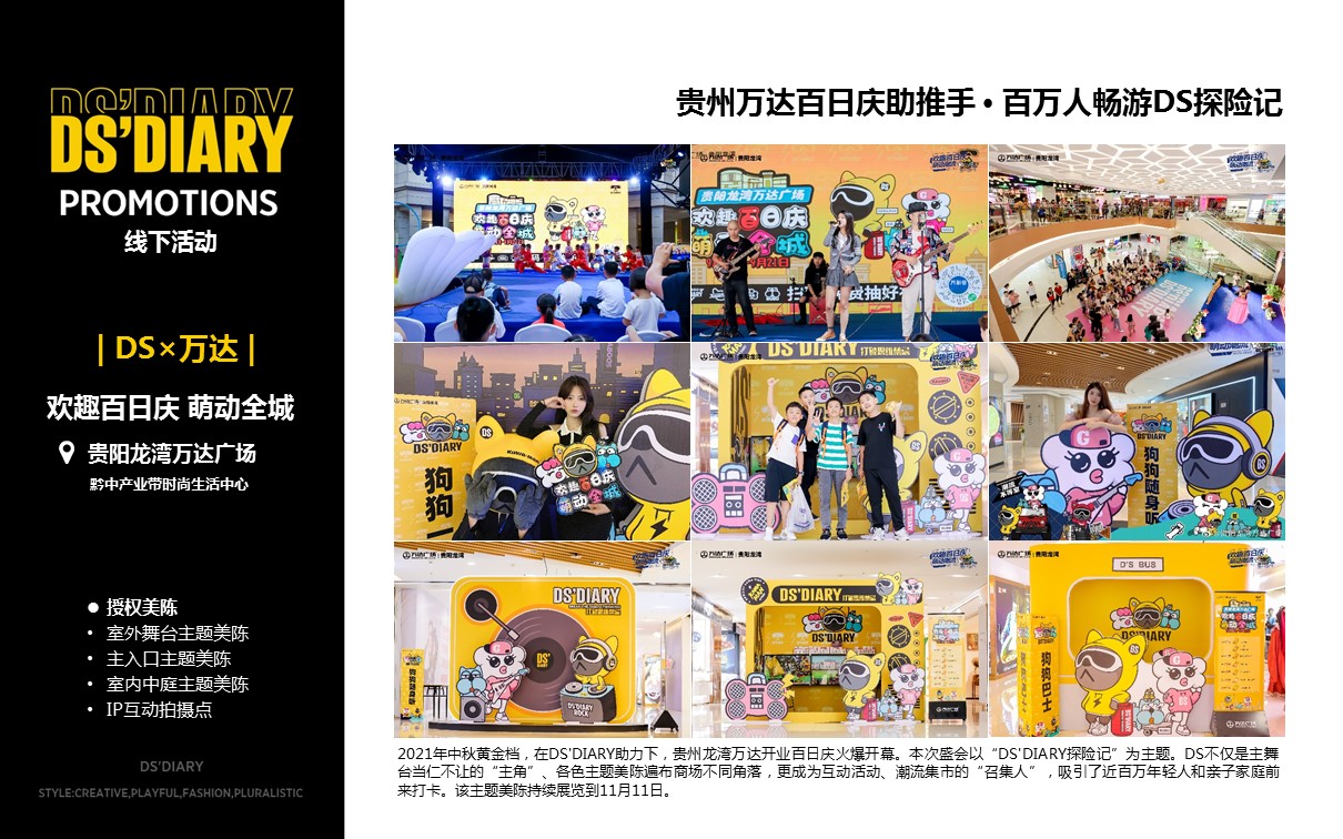 DS'DIARY长期与中国知名设计师和艺术家跨界合作,坚持原创和风格的持续创新。目前已授权品类近20个,涵盖潮玩、服饰、纸品、文具、家居、3C、轻茶饮等品类。知名合作商包括万达、振丰、敏华、北京银座、中美日化等。未来将以线下体验、品牌授权、数字藏品、IP主题项目孵化等领域为主,致力成为中国最具商业潜力的原创IP品牌。