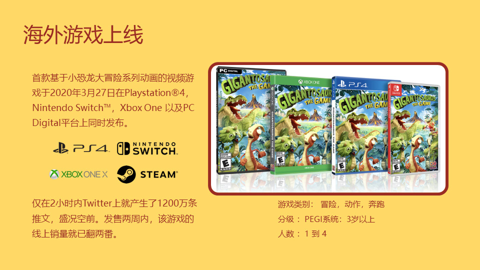 2019年于央视少儿频道首播,并多次重播,视频平台第一季优酷独播,第二季已上线各大平台(包括OTT和IPTV),第三季及番外篇《小恐龙猜猜猜》《小恐龙新闻站》于2023年寒假期间在优酷独家上线,多次上榜获得很多好成绩!大电影也在制作中... 新的番外篇Giganto Club更是采用了全球领先的实时动画渲染技术,为制作高质量的动画片提供技术支持,还可以做到即时直播,大大丰富了IP营销宣传互动方式。