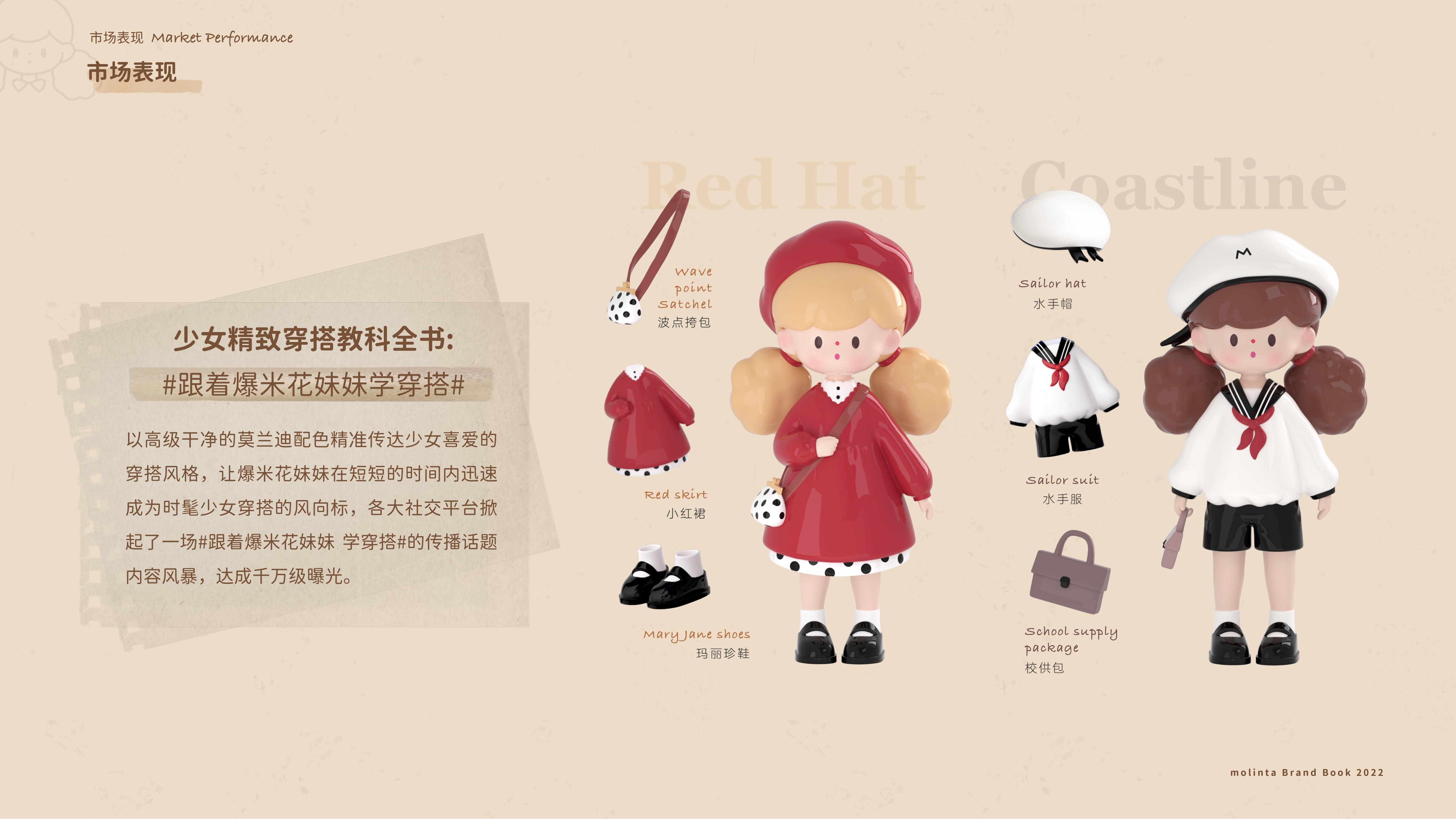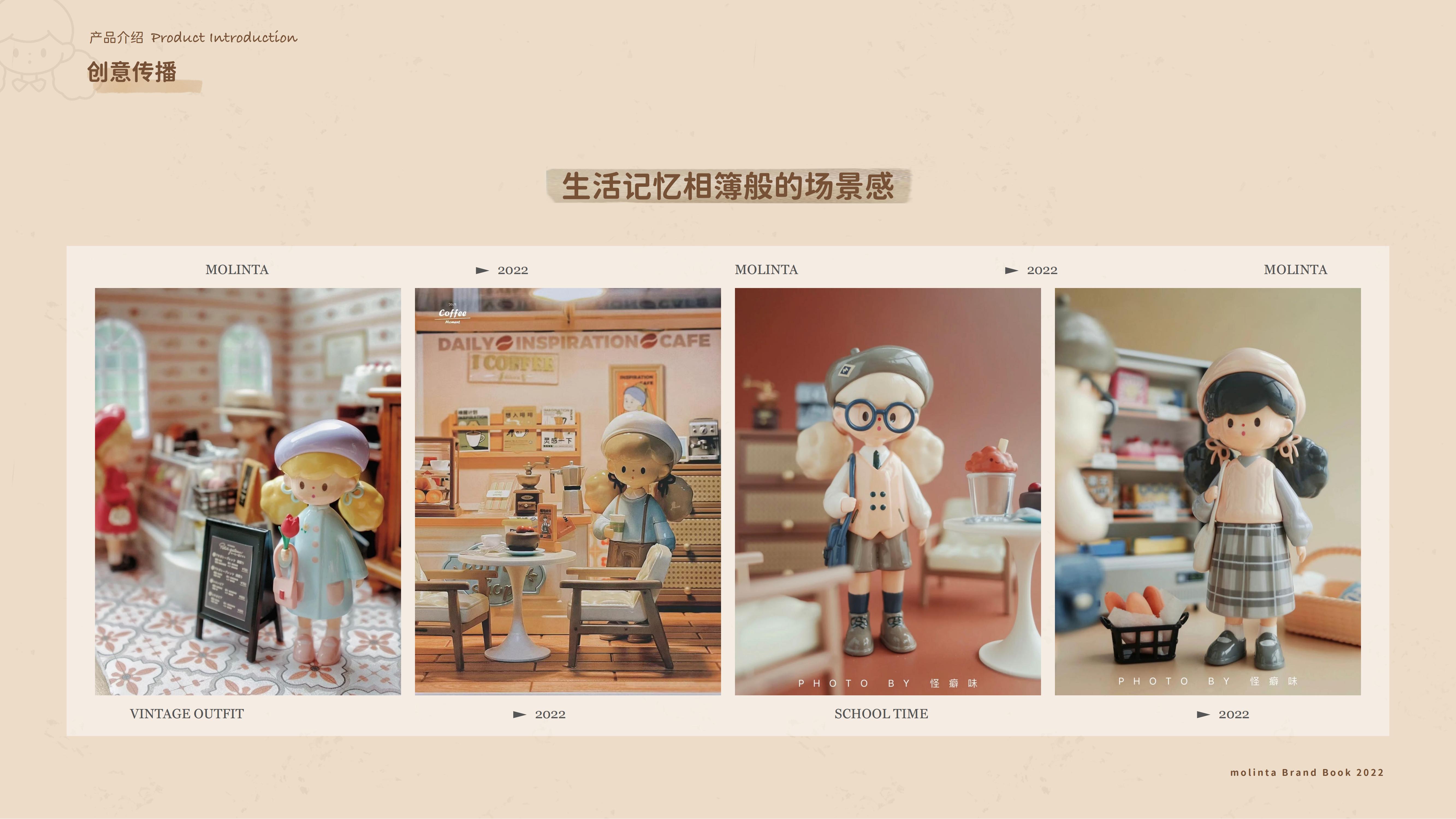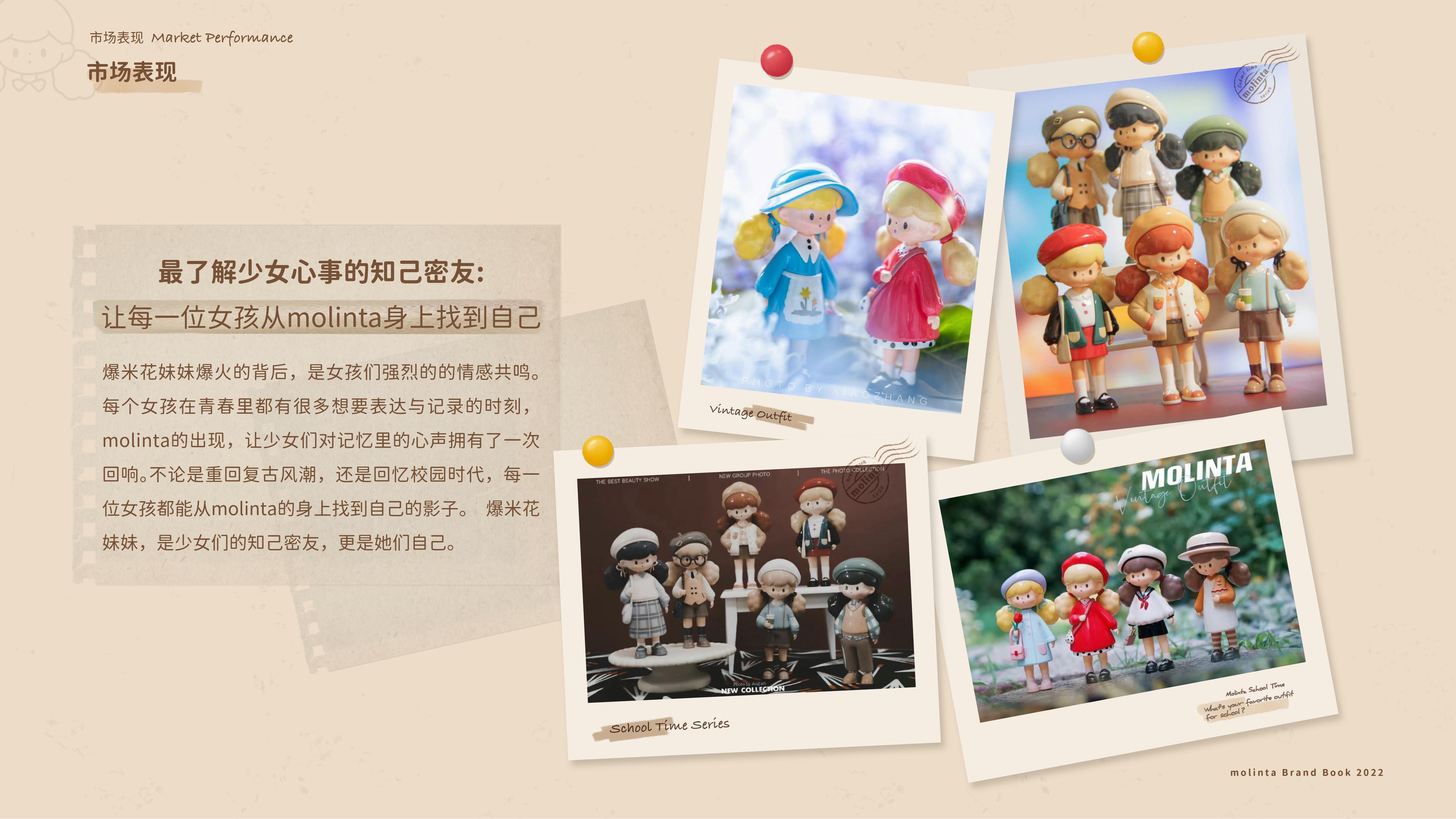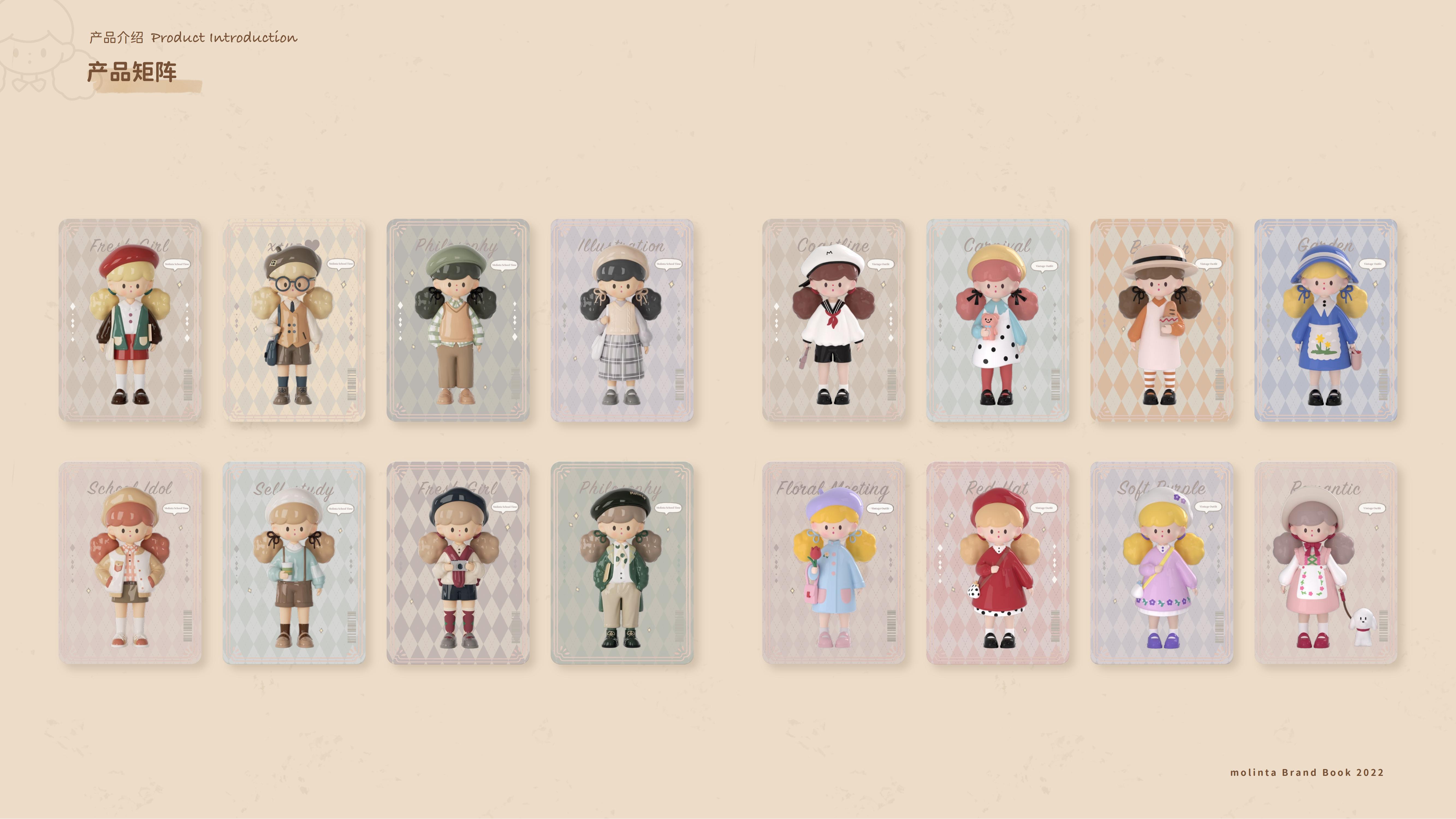 2022年5月,molinta第一套盲盒产品爆米花妹妹复古穿搭系列面世,首发一秒售,以独特的 设计风格迅速掀起一场少女复古穿搭风潮,一举成为2022年最亮眼的新生代IP。