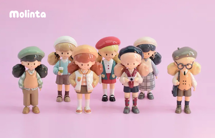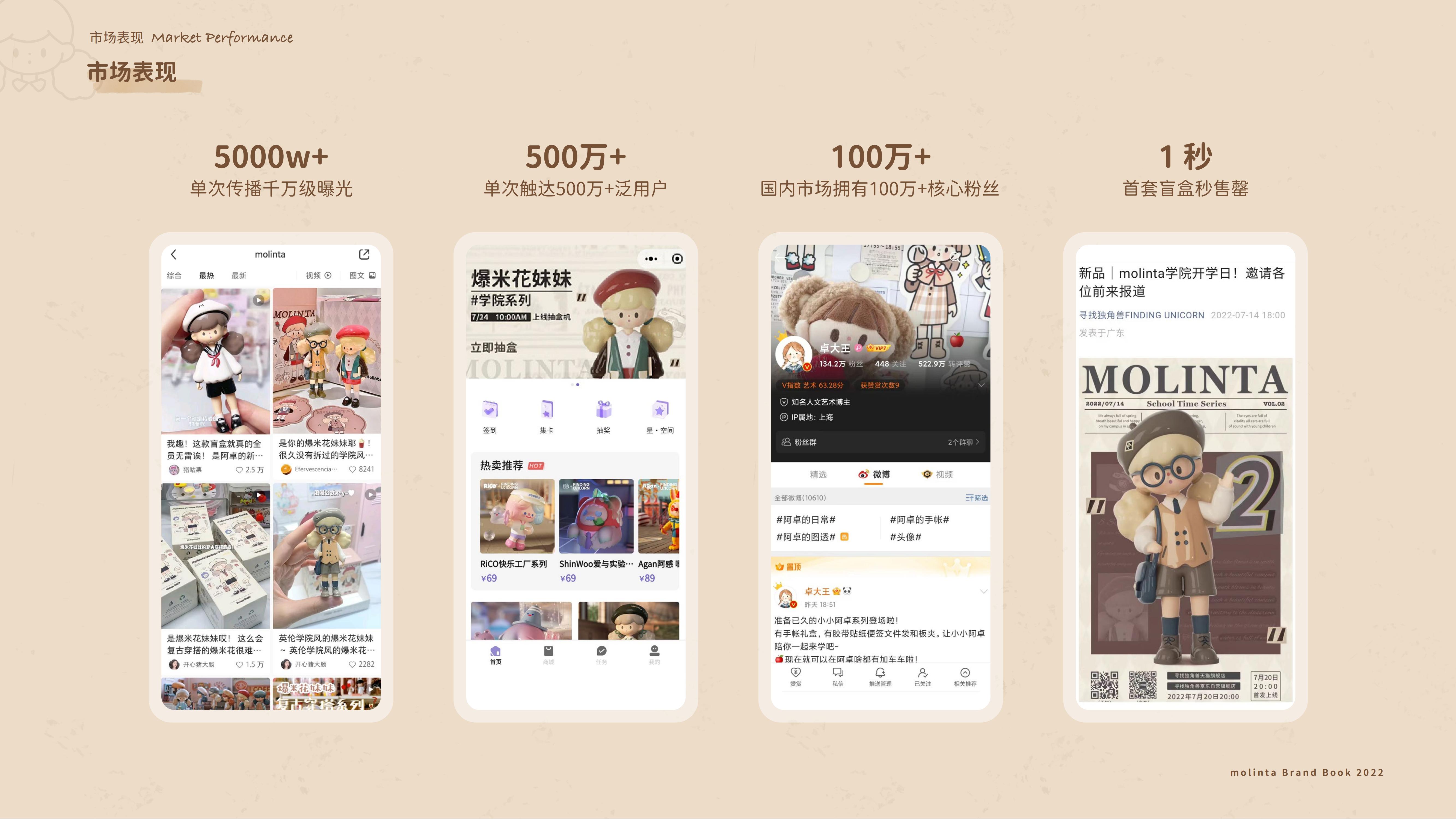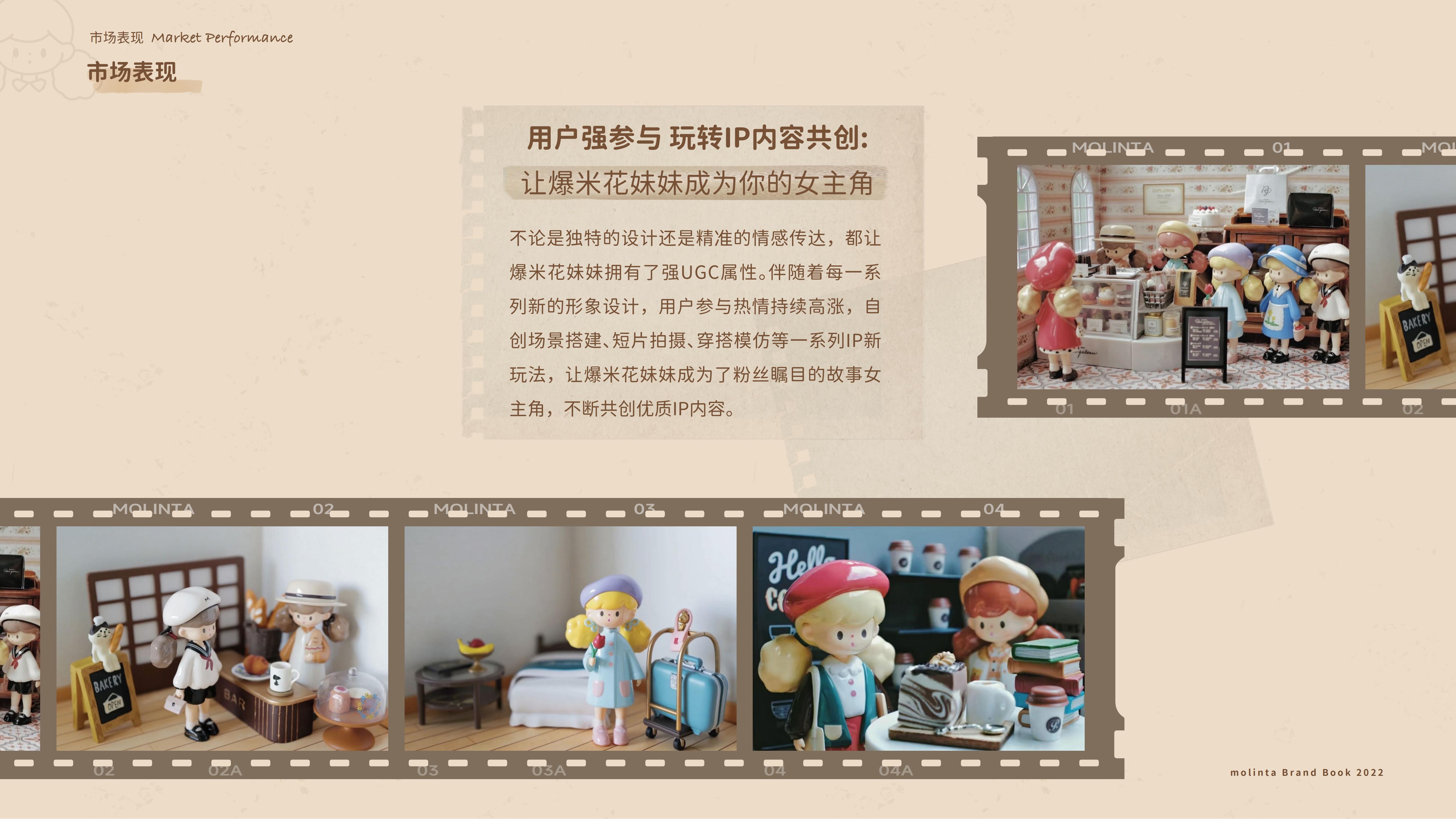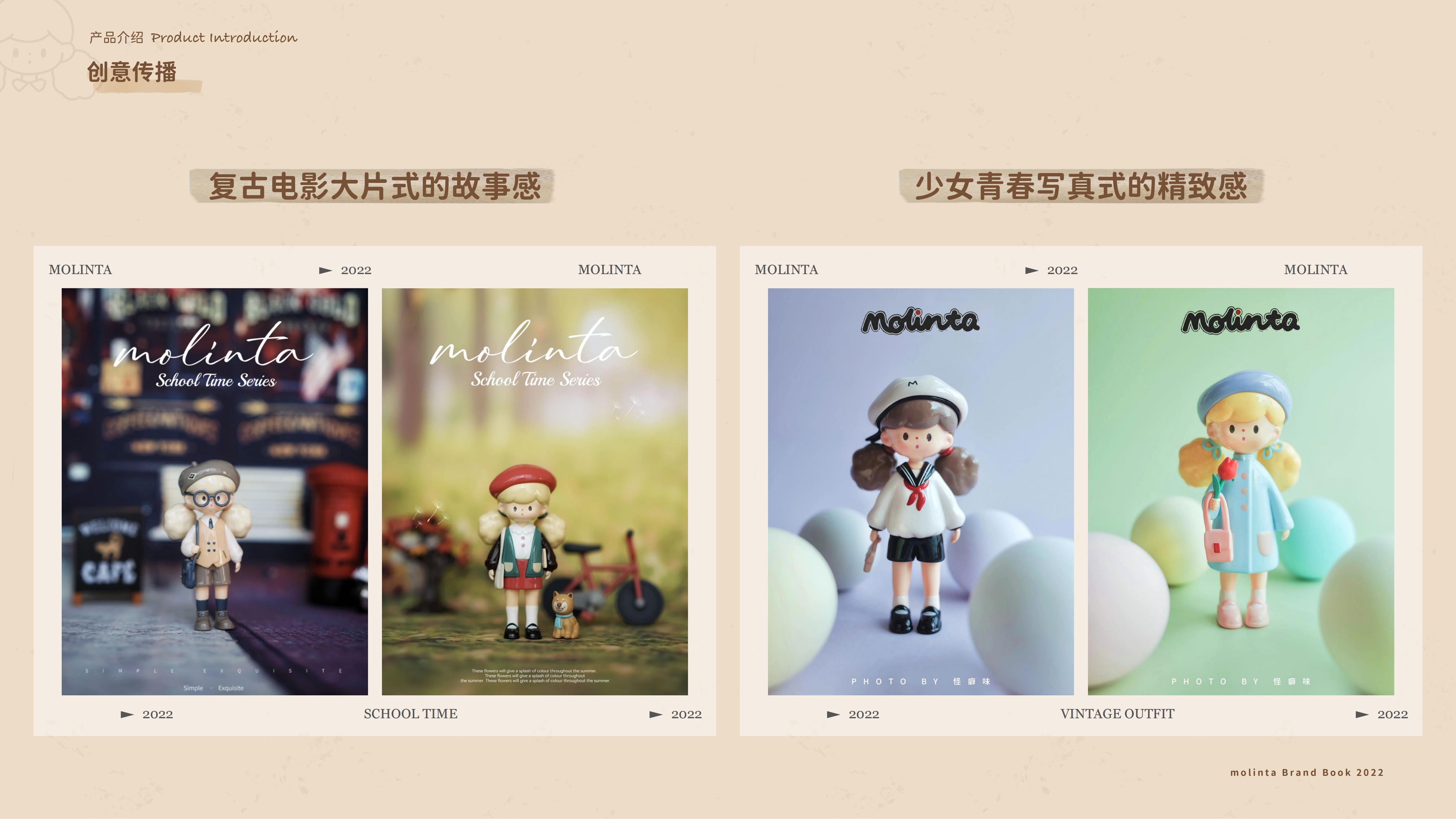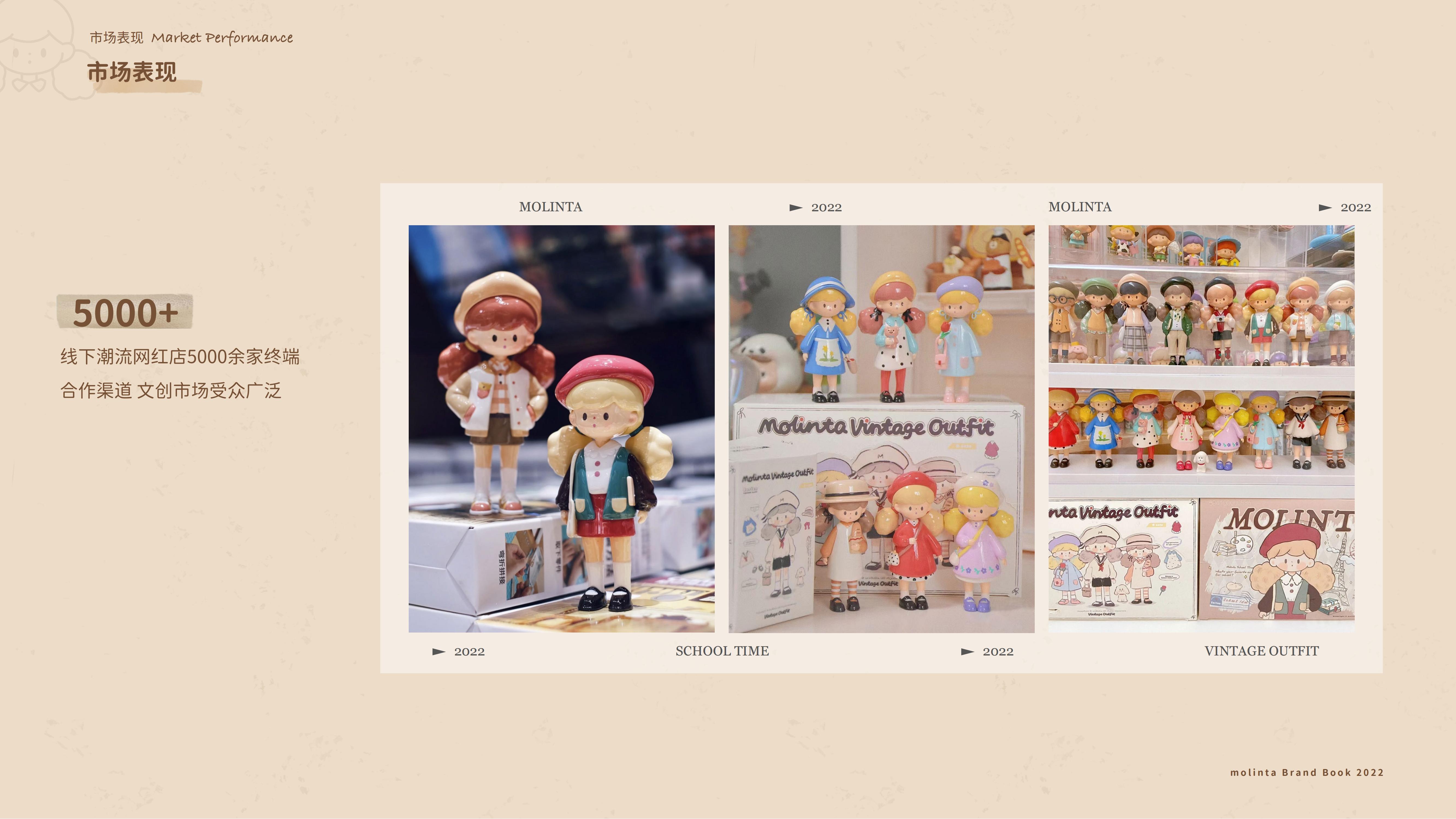 2022年5月,molinta第一套盲盒产品爆米花妹妹复古穿搭系列面世,首发一秒售,以独特的 设计风格迅速掀起一场少女复古穿搭风潮,一举成为2022年最亮眼的新生代IP。