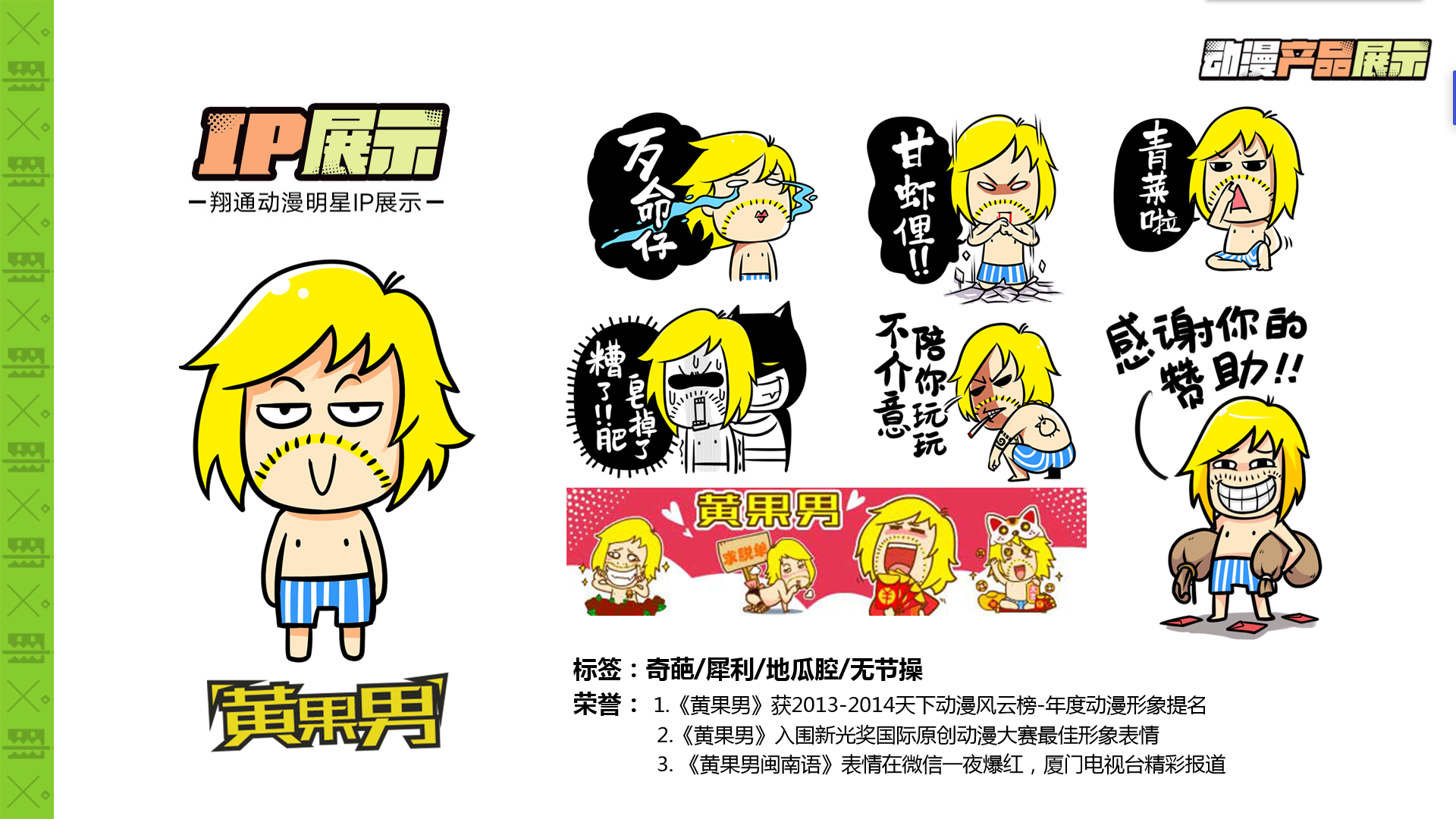 黄果男是翔通动漫原创设计的主打形象之一,自产品开发以来不断获得多个奖项,包括2013-2014天下动漫风云榜-年度动漫形象”提名、入围 2015新光奖国际原创动漫大赛最佳形象表情奖等,其动漫作品如《黑叫兽与黄果男》、《我槽天下》浏览量高达四百多万,形象表情包则在微信等各大社交平台 上线,其中仅闽南语系列下载量就有十多万,同时还引起了电视台的关注,厦门广播电视台《第1民生》栏目组采访热播黄果网络蹿红背后的故事。