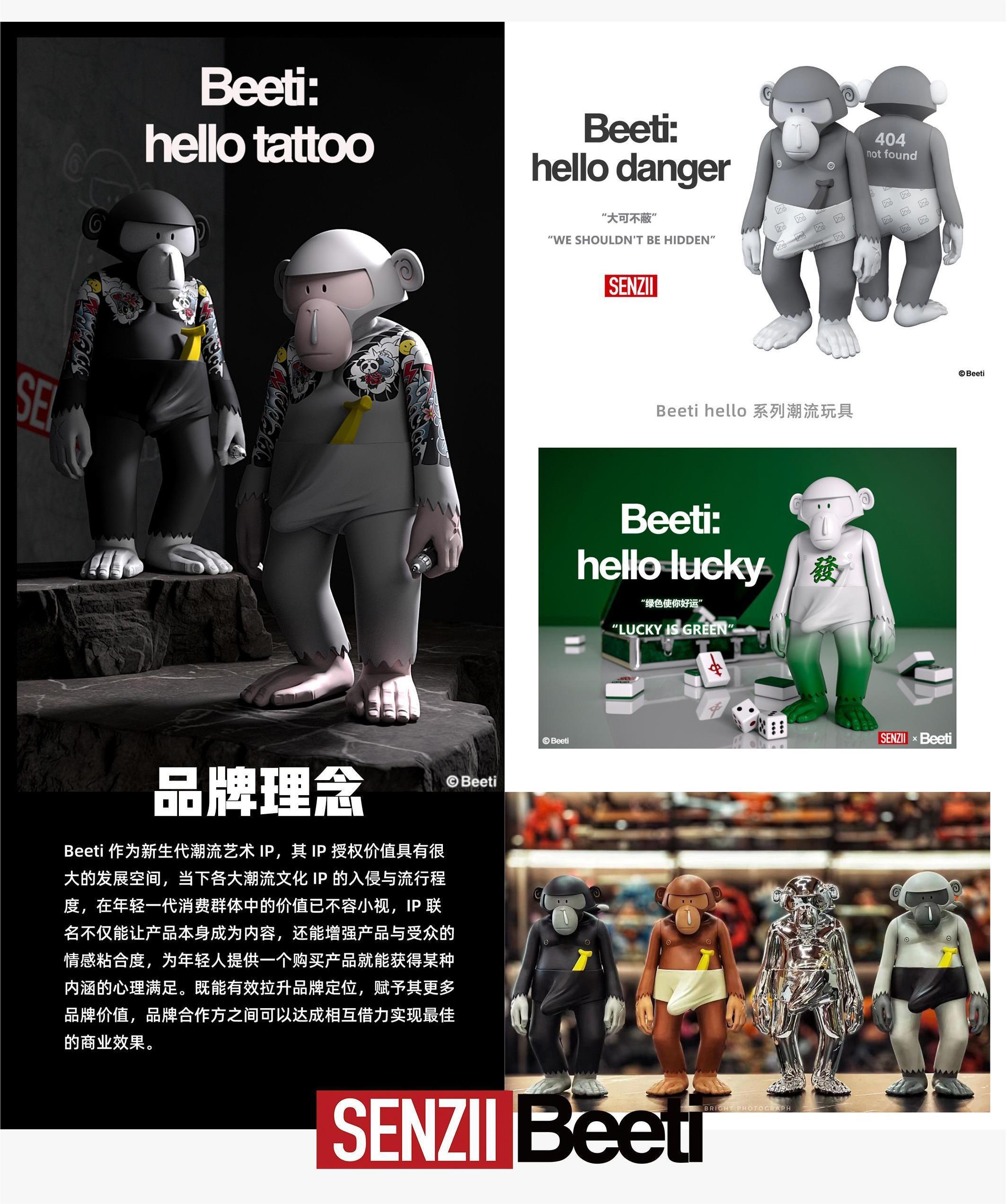 BEETI HELLO系列,主要是以Beeti的基础形象进行多样的艺术设计,系列产品材质以树脂和搪胶为主,比例以100% 、400%、1000%为主。