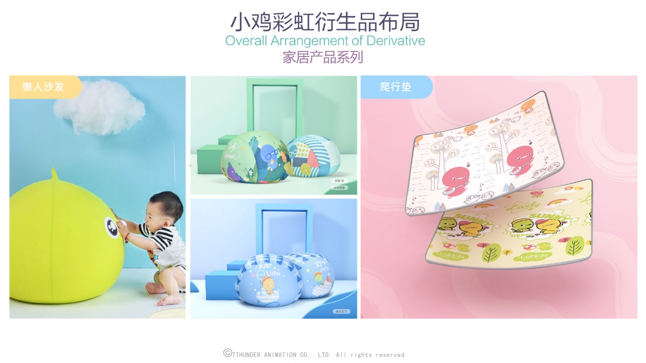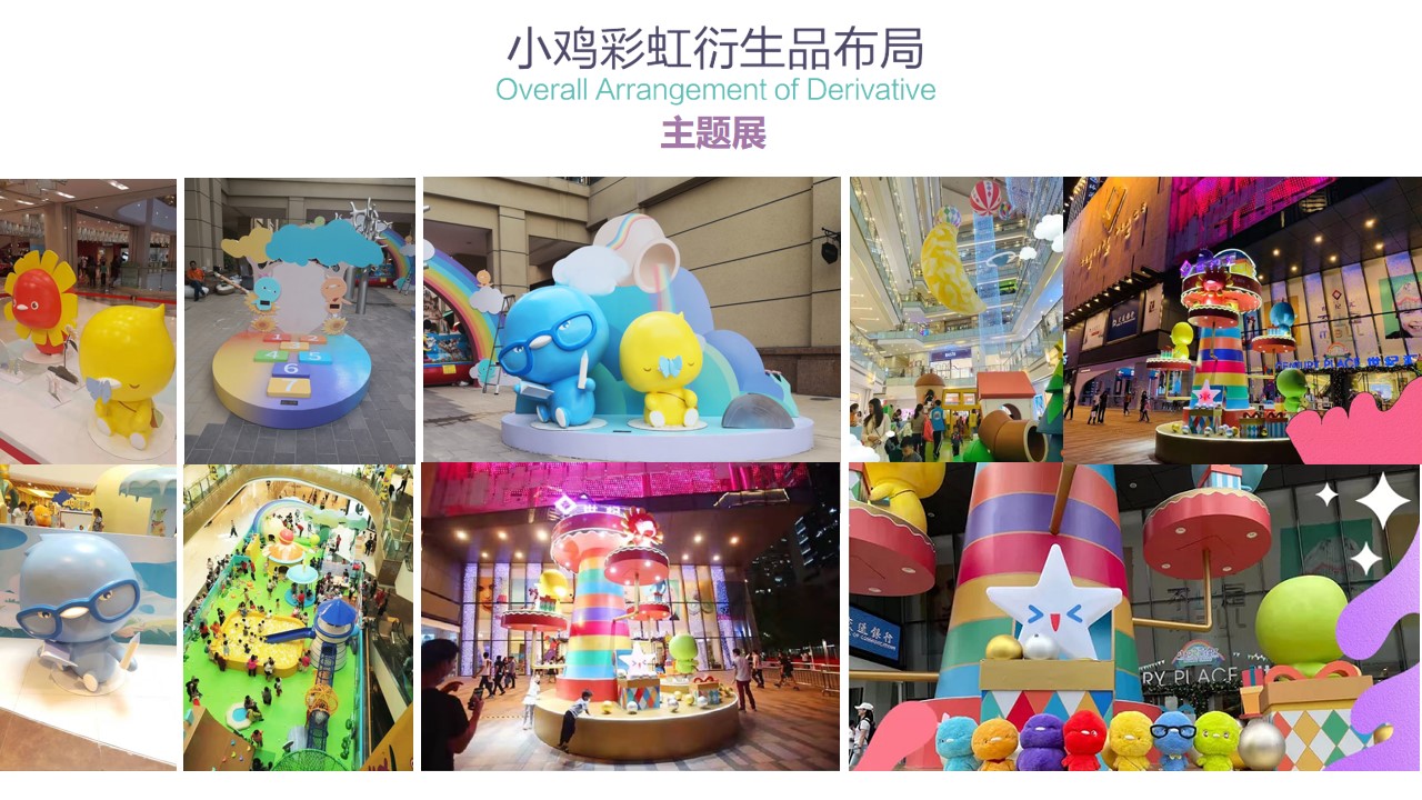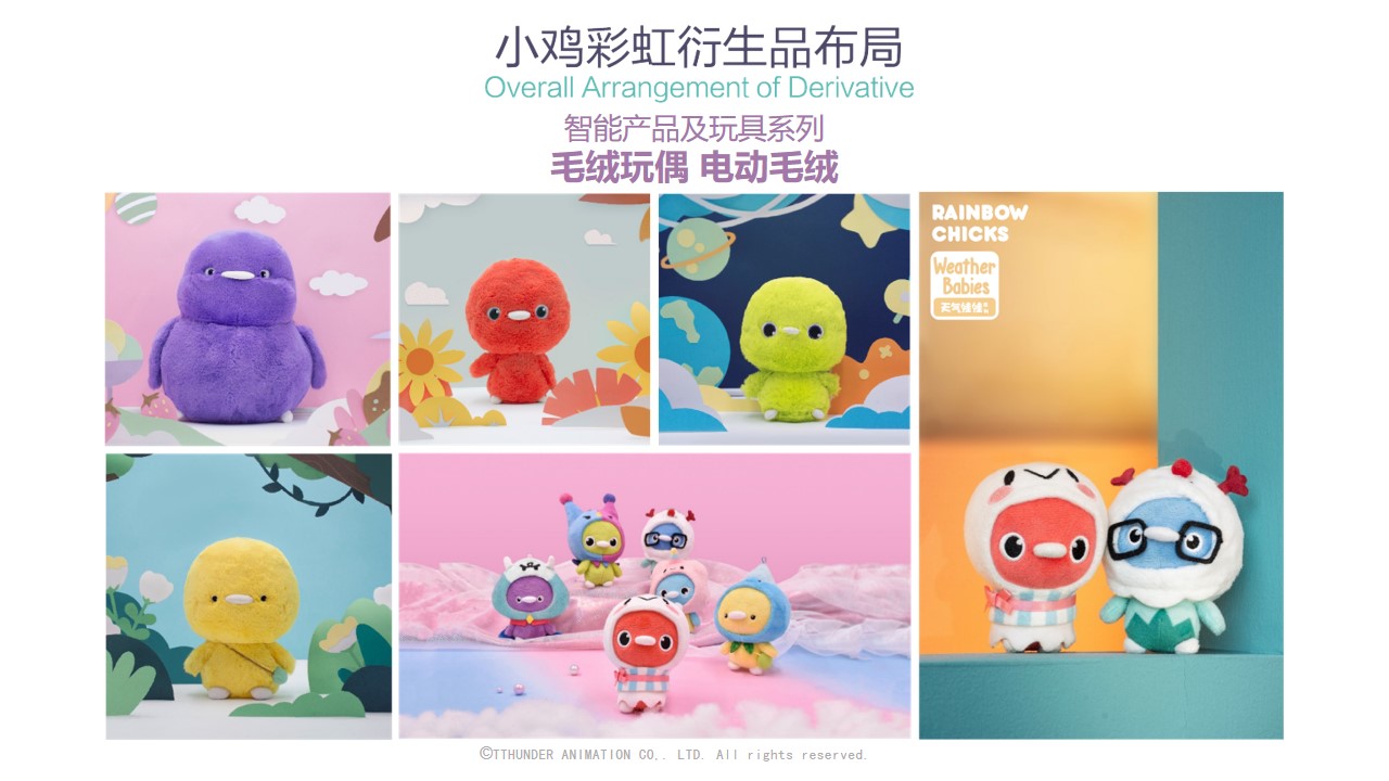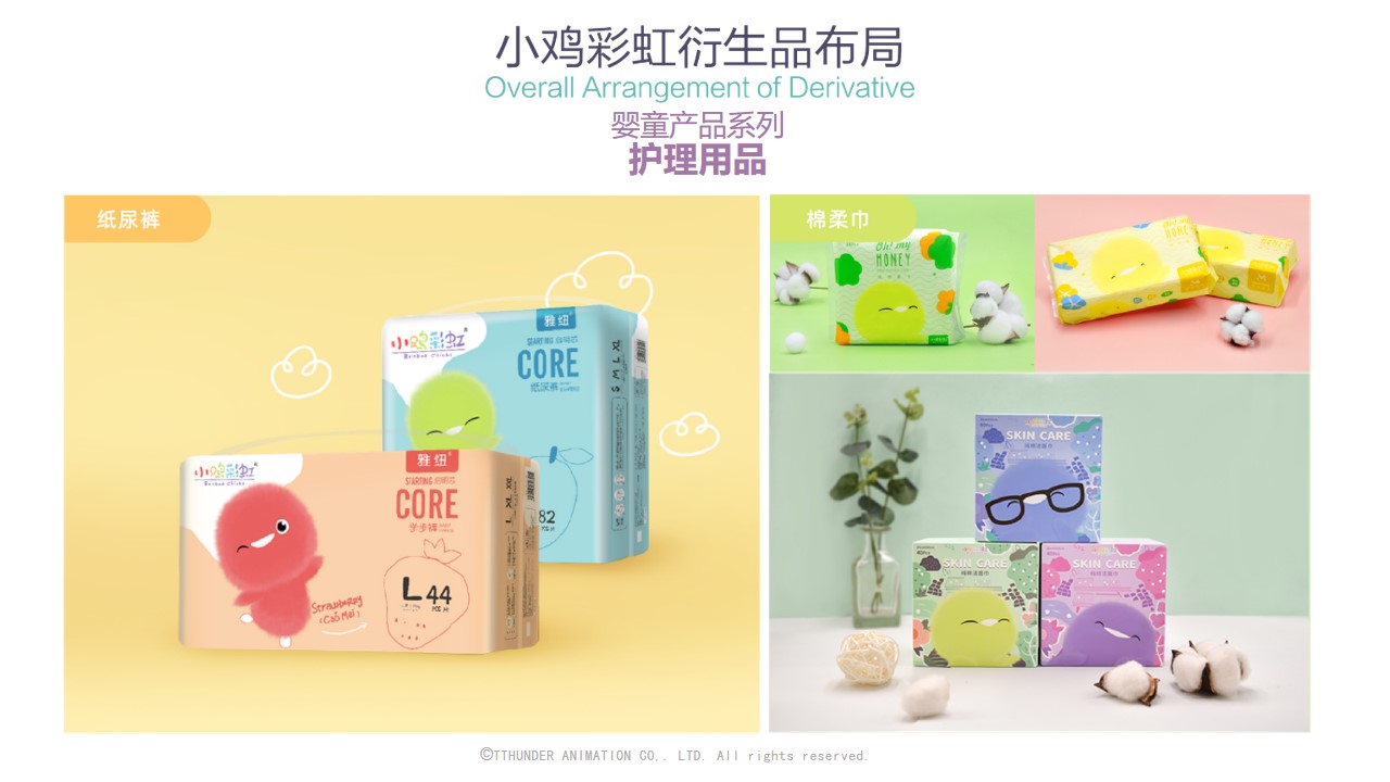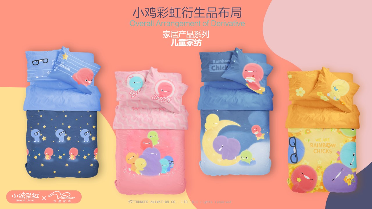 截至目前为止,小鸡彩虹授权合作的品牌近百家包括万事利,水晶家纺,必胜客等,衍生品品类达150种。
