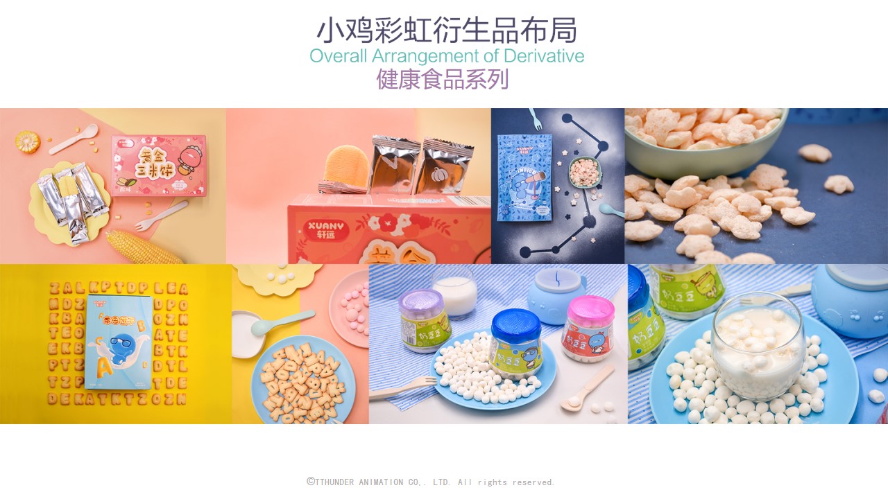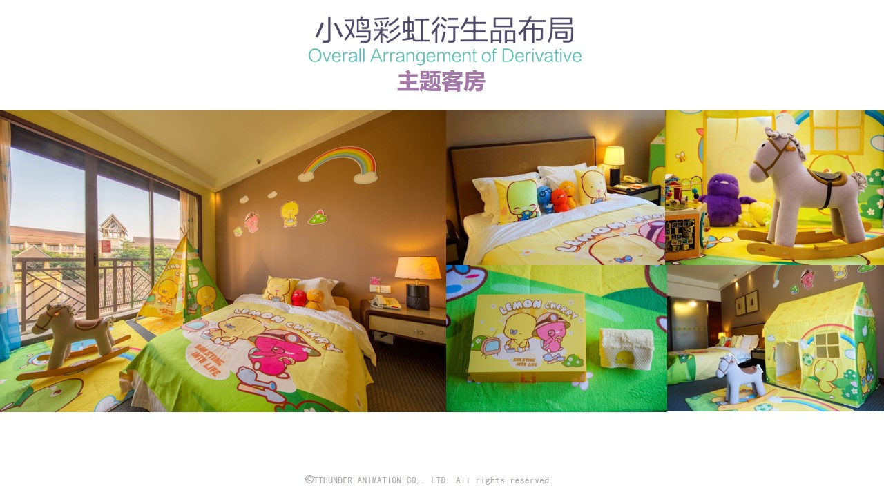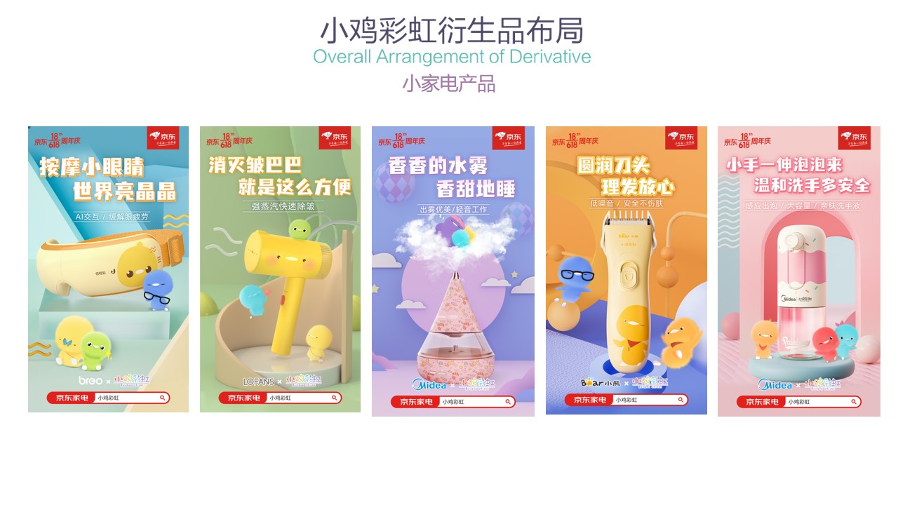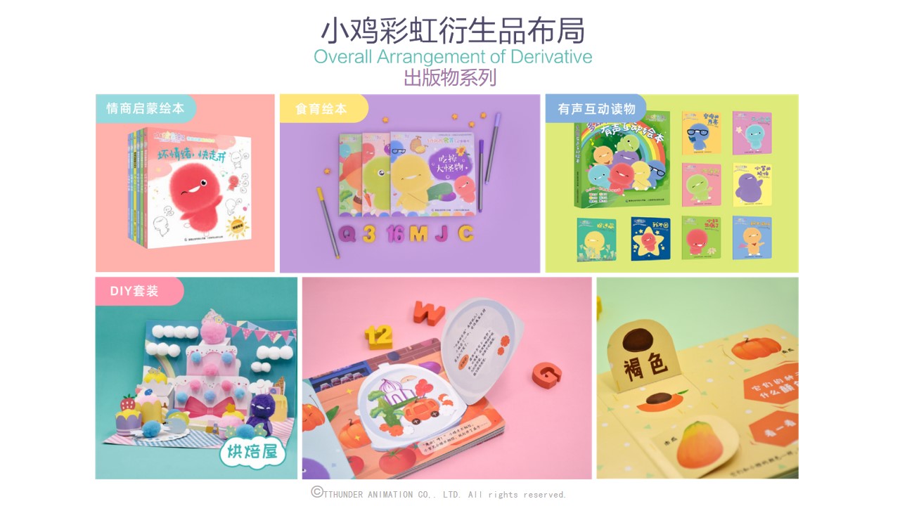 截至目前为止,小鸡彩虹授权合作的品牌近百家包括万事利,水晶家纺,必胜客等,衍生品品类达150种。