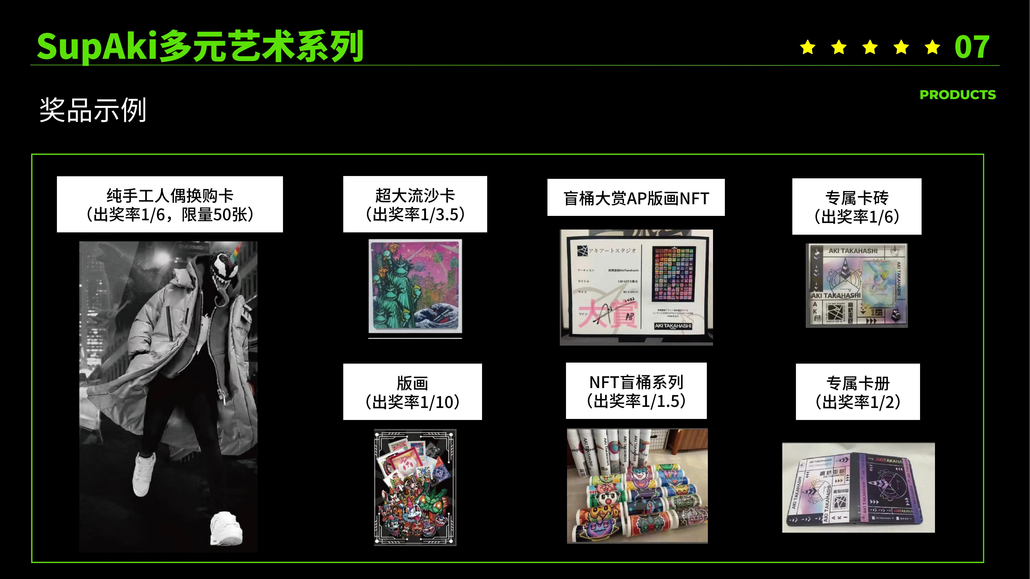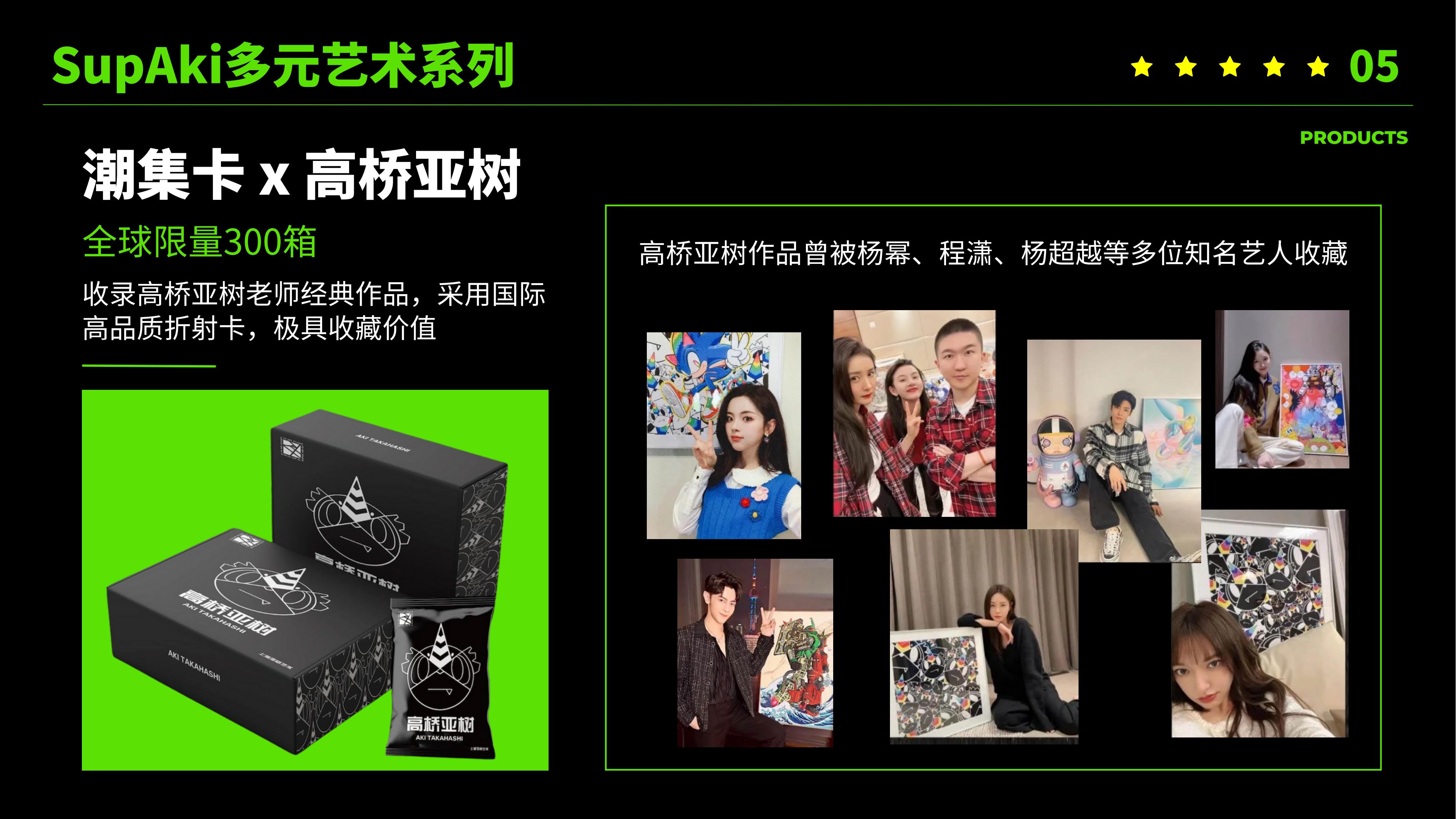 ⽬前已签约⾼桥亚树等10+位知名潮流艺术家。⾼级的卡⾯设计、精致细腻的⼯艺、极具收藏价值的艺术⽂化内容,让潮集卡产品实现⼴泛“出圈”,凝聚优质的18-40岁潮流粉丝群体。SupAki多元艺术系列第⼀代产品7⽇内售罄 ,创⾏业现象级爆款。