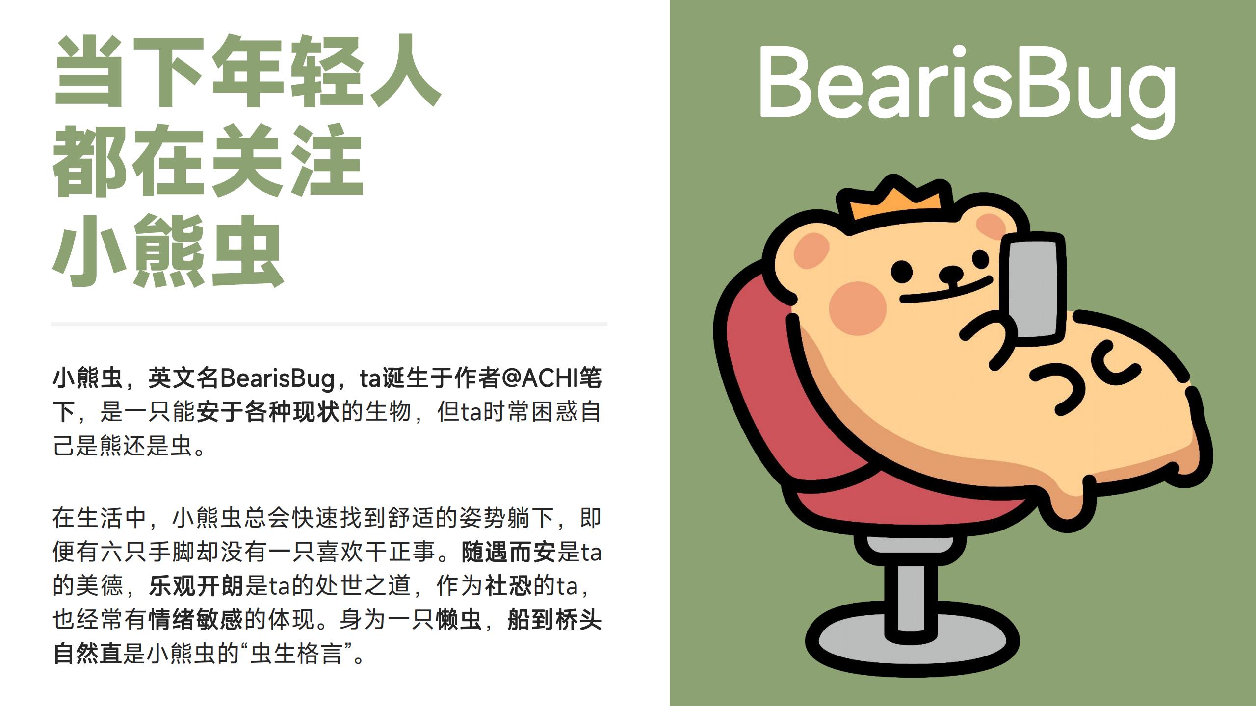 小熊虫,英文名BearisBug,ta诞生于作者@ACHI笔 下,是一只能安于各种现状的生物,但ta时常困惑自 己是熊还是虫。 在生活中,小熊虫总会快速找到舒适的姿势躺下,即 便有六只手脚却没有一只喜欢干正事。随遇而安是ta 的美德,乐观开朗是ta的处世之道,作为社恐的ta, 也经常有情绪敏感的体现。身为一只懒虫,船到桥头 自然直是小熊虫的“虫生格言