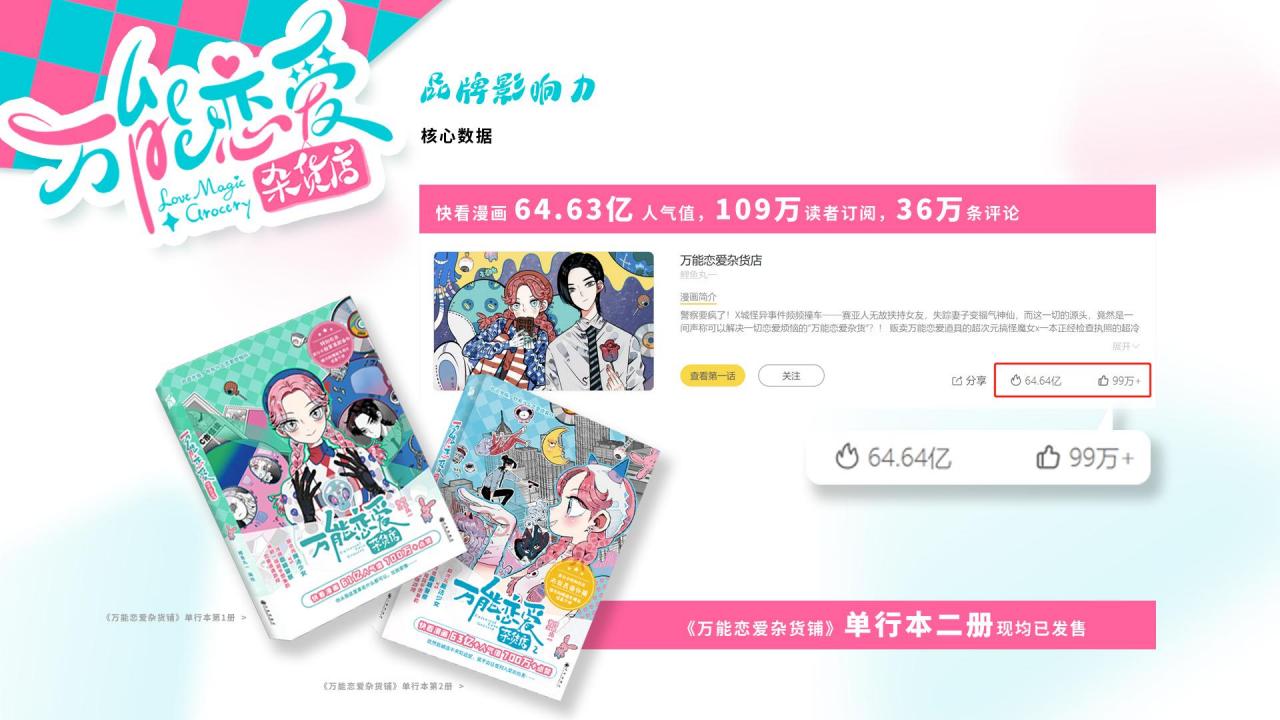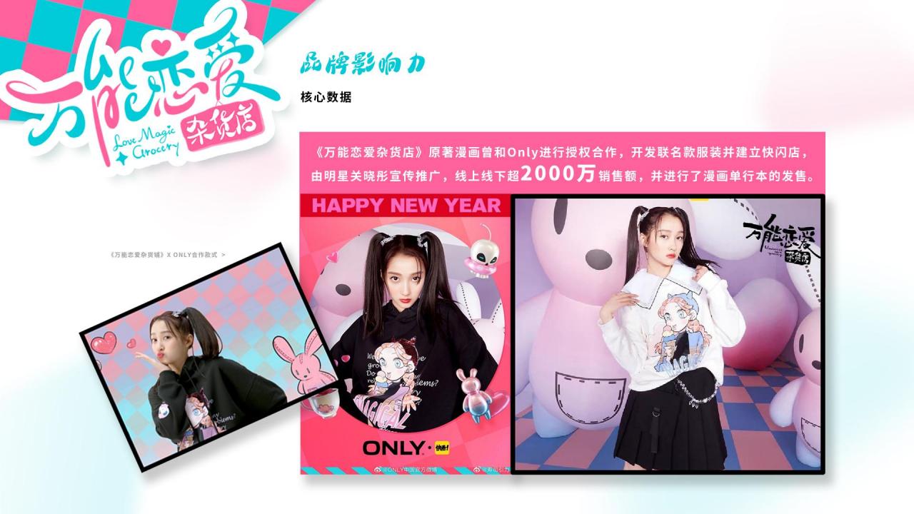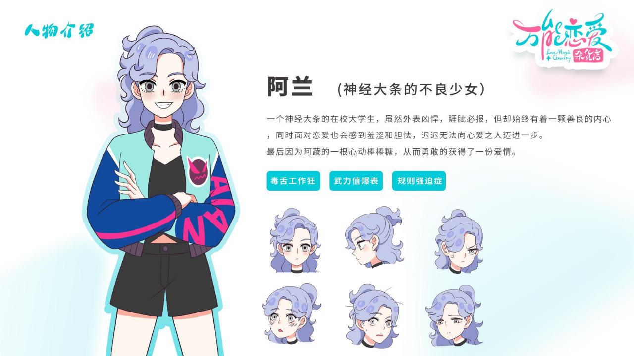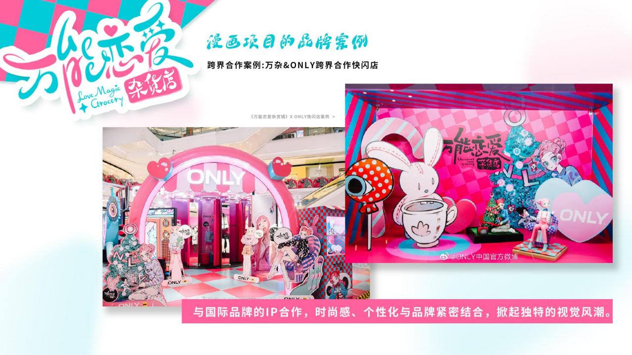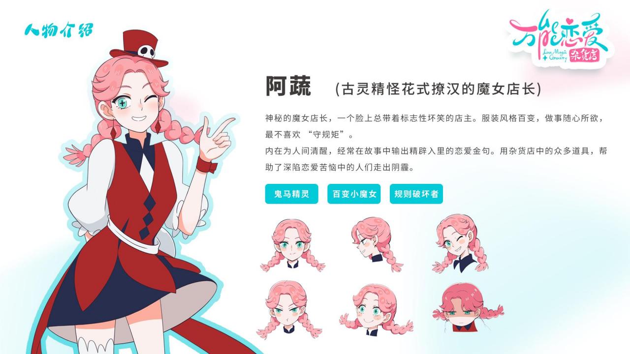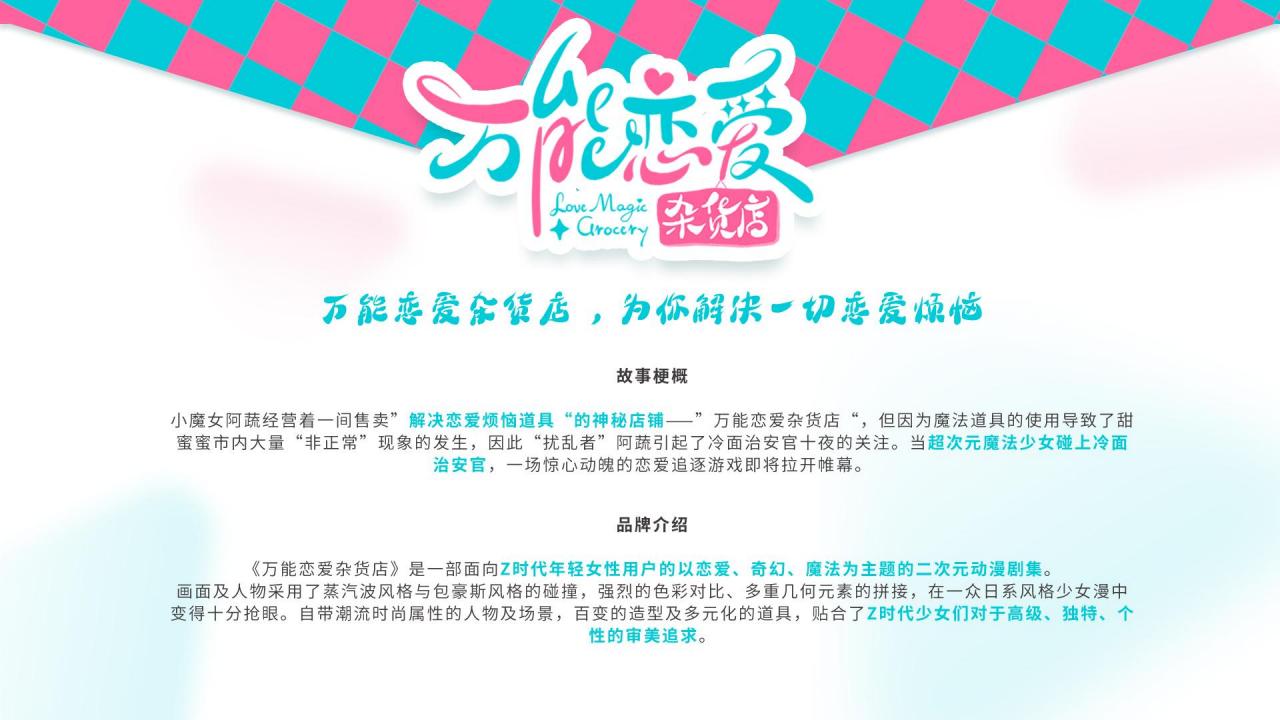 万能恋爱杂货店,为你解决一切恋爱烦恼 故事梗概 小魔女阿蔬经营着一间售卖”解决恋爱烦恼道具“的神秘店铺—”万能恋爱杂货店“,但因为魔法道具的使用导致了甜蜜蜜市内大量“非正常”现象的发生,因此“扰乱者”阿蔬引起了冷面治安官十夜的关注。当超次元魔法少女碰上冷面治安官,一场惊心动魄的恋爱追逐游戏即将拉开帷幕。 品牌介绍 《万能恋爱杂货店》是一部面向Z时代年轻女性用户的以恋爱、奇幻、魔法为主题的二次元动漫剧集。画面及人物采用了蒸汽波风格与包豪斯风格的碰撞,强烈的色彩对比、多重几何元素的拼接,在一众日系风格少女漫中变得十分抢眼。自带潮流时尚属性的人物及场景,百变的造型及多元化的道具,贴合了Z时代少女们对于高级、独特、个性的审美追求。