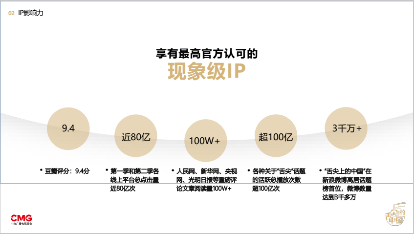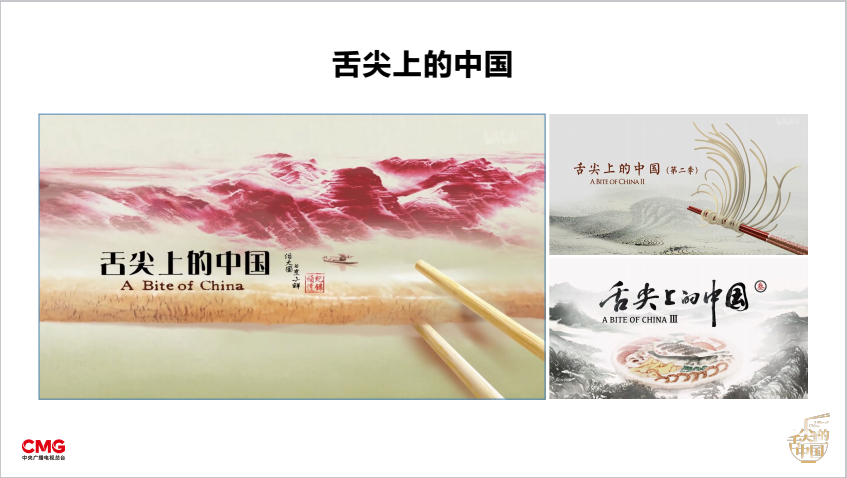 《舌尖上的中国》 由中央广播电视总台摄制的经典纪录片《舌尖上的中国》,唤醒了人们对于 食物的记忆、家的记忆、民族的记忆。它完美诠释了人与自然和谐相处的方 式,通过美食向人们传 递 正确的价值观念、人际关系、生存状态。在追求高 效便捷的速食时代,《舌尖上的中国》让人们回到“一日三餐”的情愫中。 《舌尖上的中国》用餐桌智慧、美食故事带动 了蓬勃发展的中华“美食经济”,形成了海内外华人爱家、思乡的中华味觉地图,十余年来热度不减。百花齐放的民间美食品牌在《舌尖上的中国》的孕育下迸发出旺盛的生命力。 从美食故事到美食经济时代的车轮滚滚向前,那些更传统的、更优质的、更乡土的、更能代表中国的美食,更应该被留在每个人、每个家的餐桌之上, 才下舌尖,又上心间。