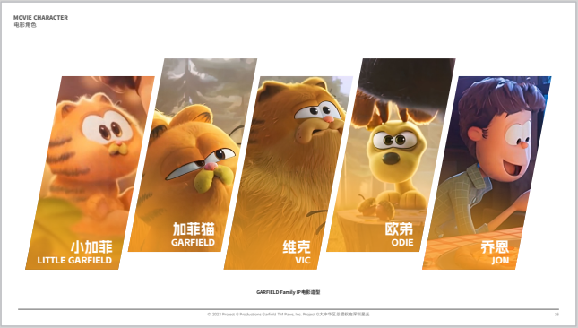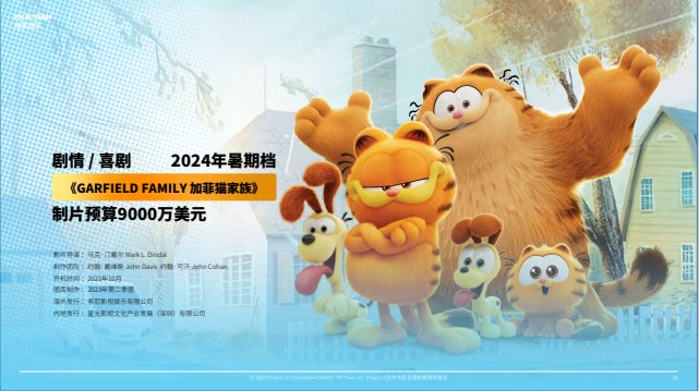 剧情 / 喜剧 2024年暑期档 《GARFIELD FAMILY 加菲猫家族》 影片导演 :马克·汀戴尔 Mark L. Dindal 制作团队 :约翰·戴维斯 John Davis 约翰·可汗 John Cohan 开机时间 :2021年10月 图库制作 :2023年第二季度 海外发行 :索尼影视娱乐有限公司