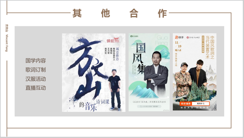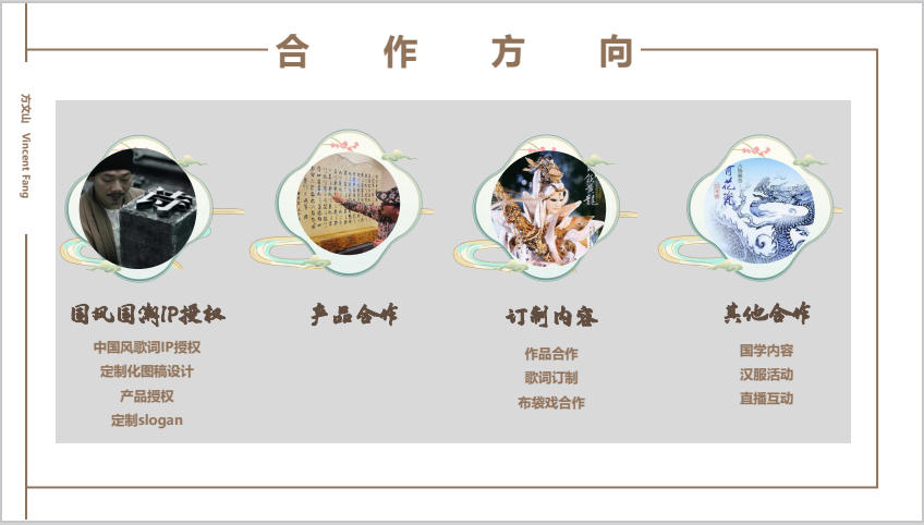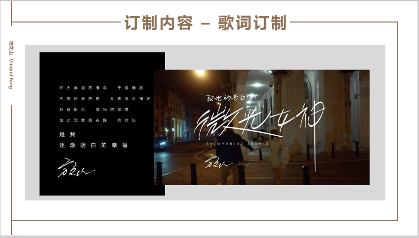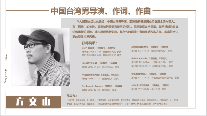 中国风歌词IP授权/歌词定制 定制化图稿设计/产品授权 方文山 中国台湾男导演、作词、作曲 华人版图出版社总编辑,中国台湾男导演、亚洲流行天王周杰伦御用**作词人, 有“词圣”的美誉。其擅长拆解语言使用的惯性,重新浇灌文字重量,赋予其新的意义, 纺织出新的质地,建构后现代新词风。其创作的词曲中有画面感和东方风,非常符合江 湖的整体音乐风格。