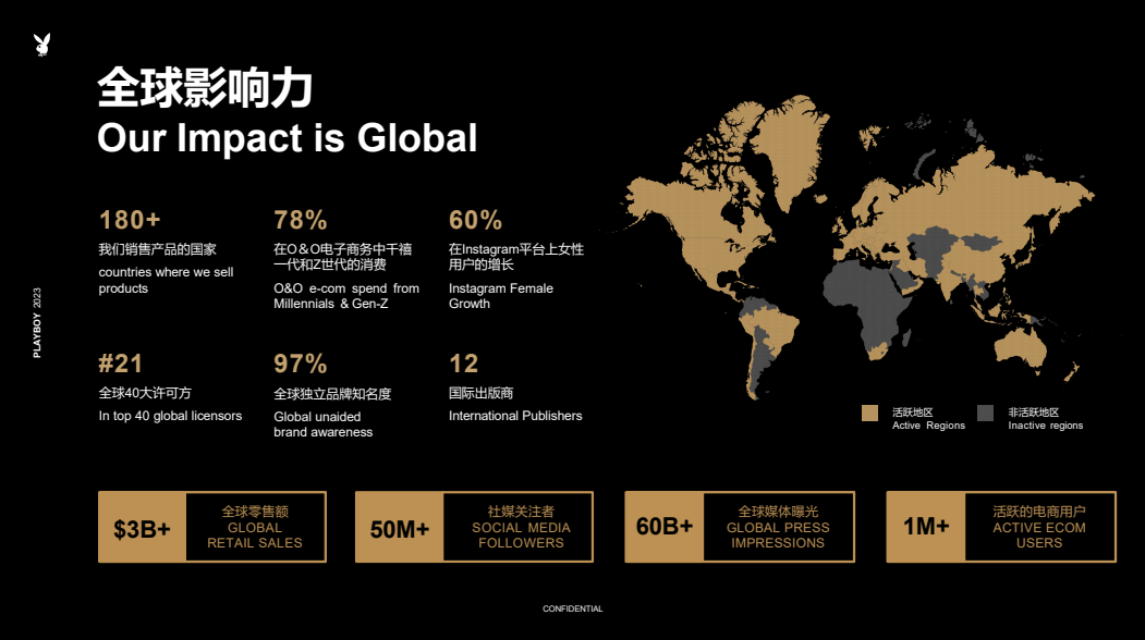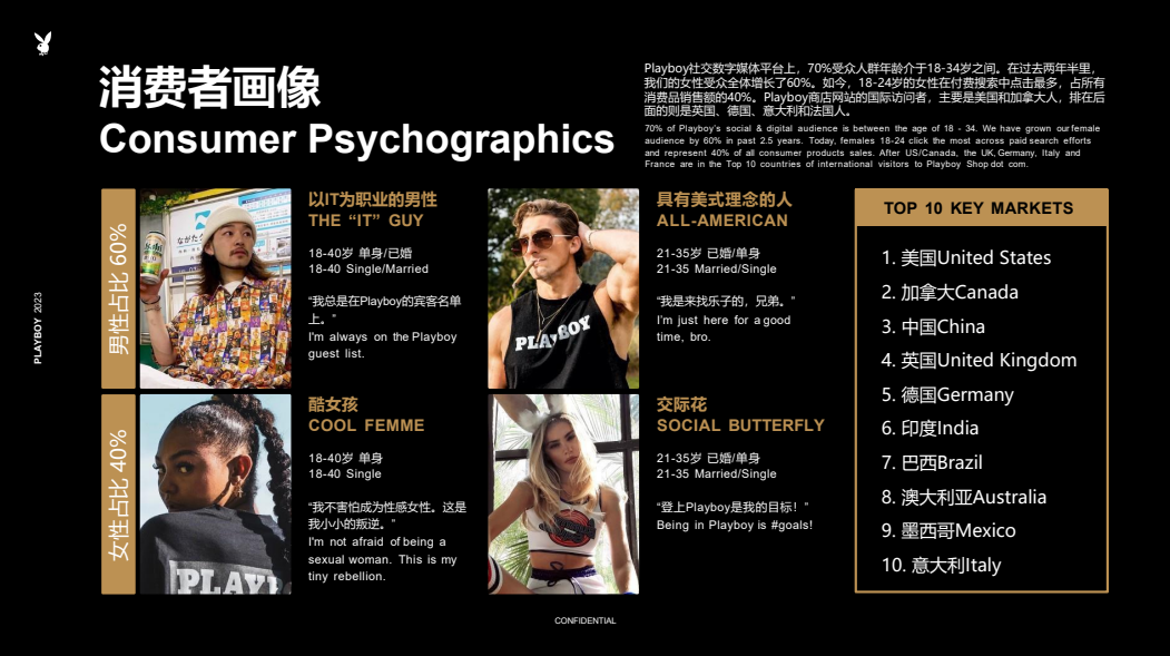 Playboy的消费者年龄在18-45岁之间。86%的客群年龄在44岁以下,60%是 男性,40%是女性。他们思想开放,珍视包容性和自由言论。对万事充满好奇, 真实,注重情感连结,并持积极的性态度。