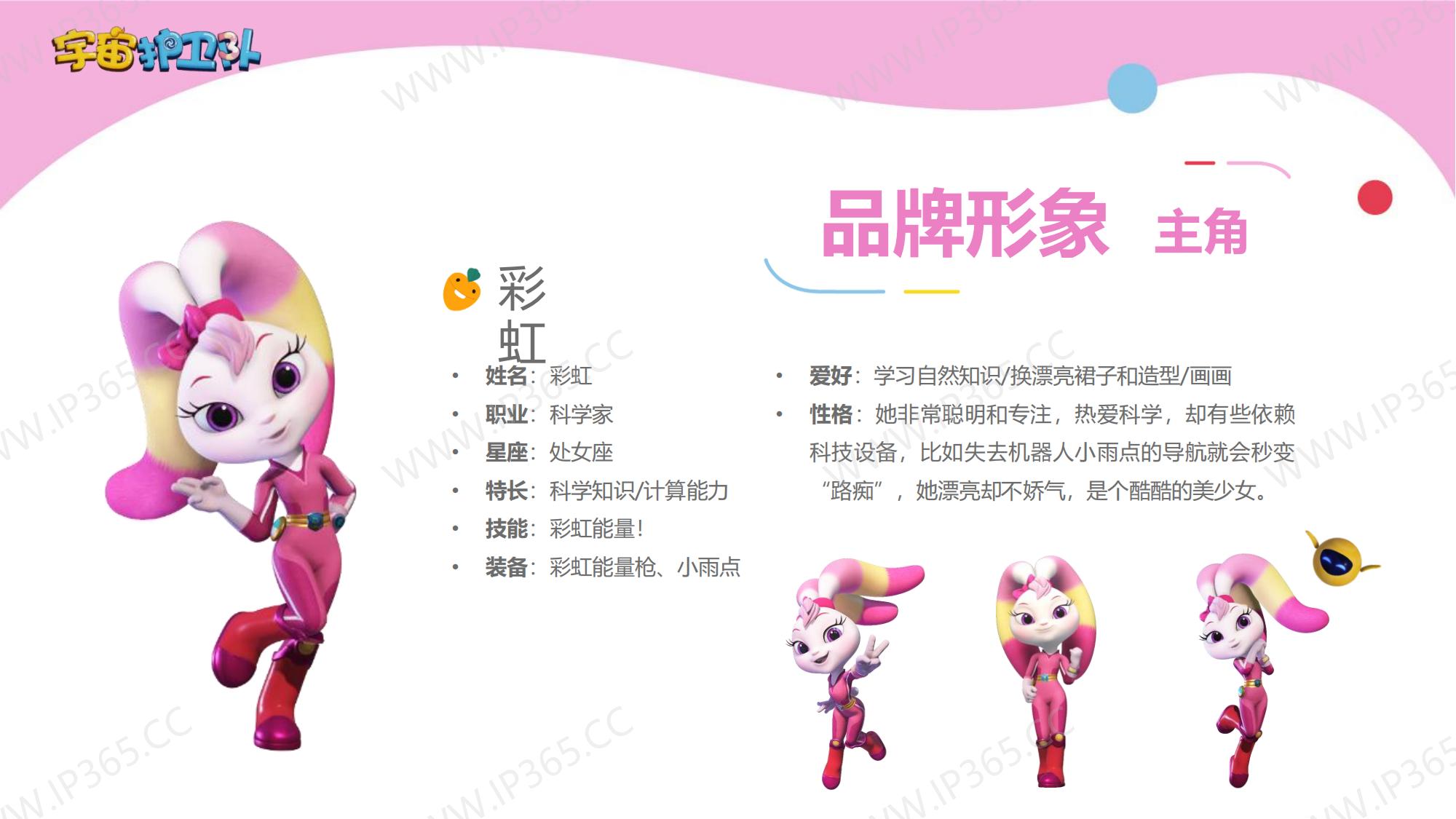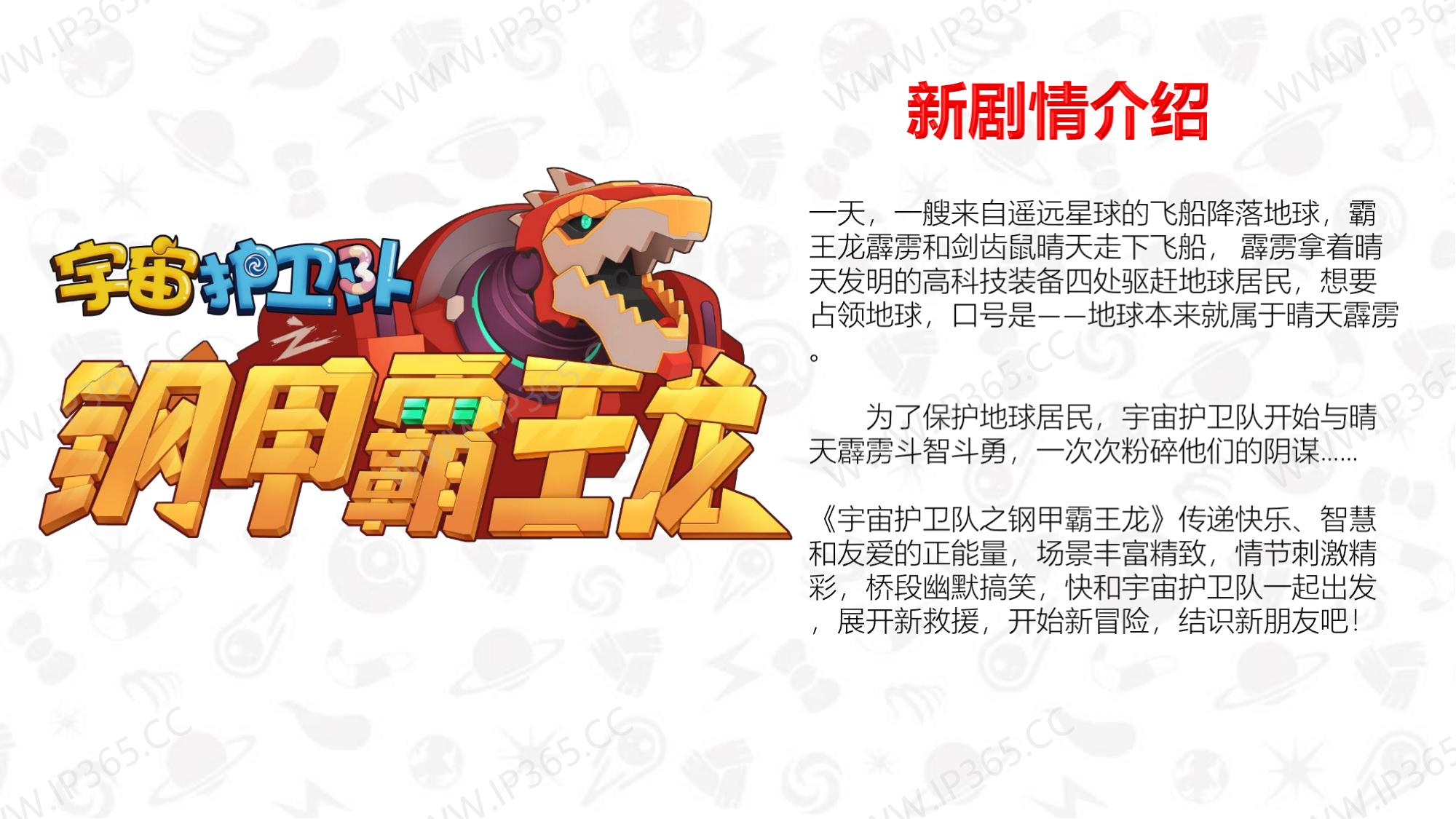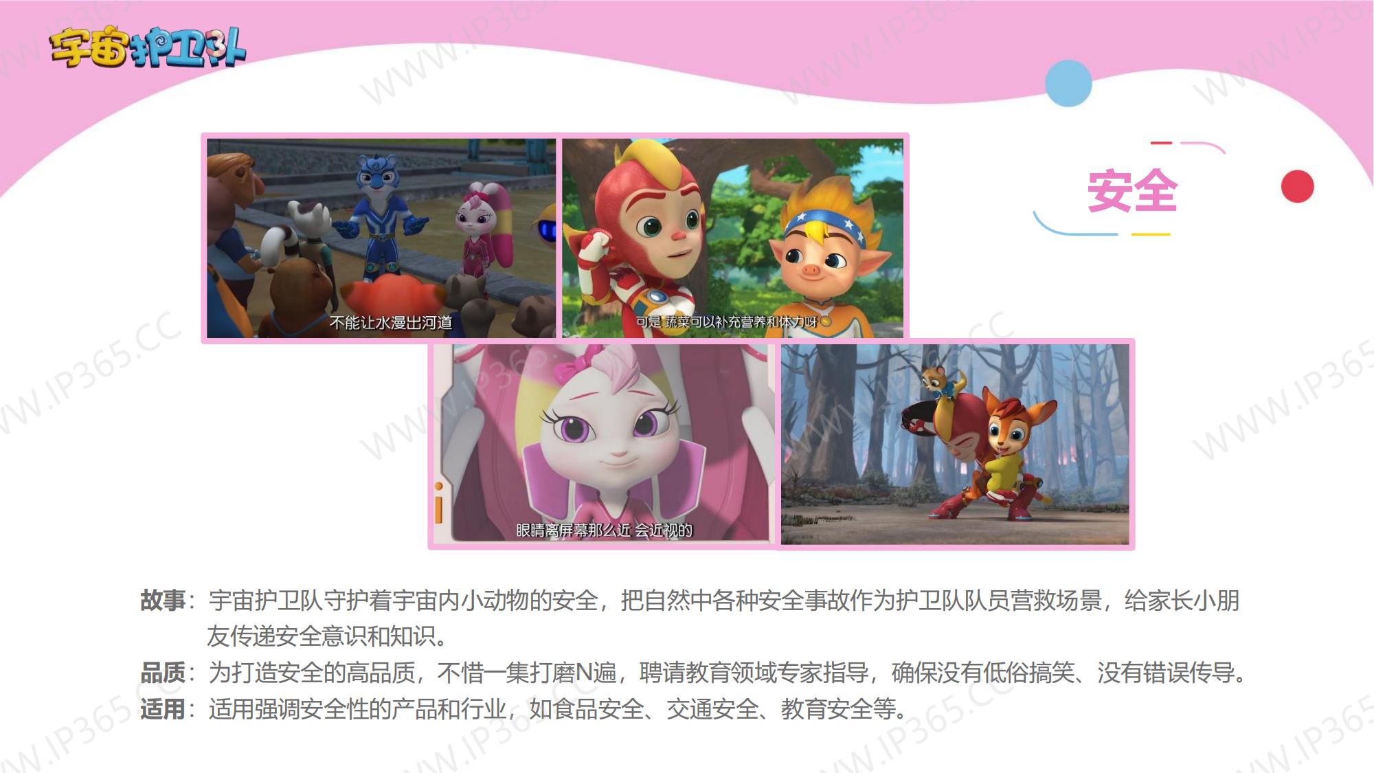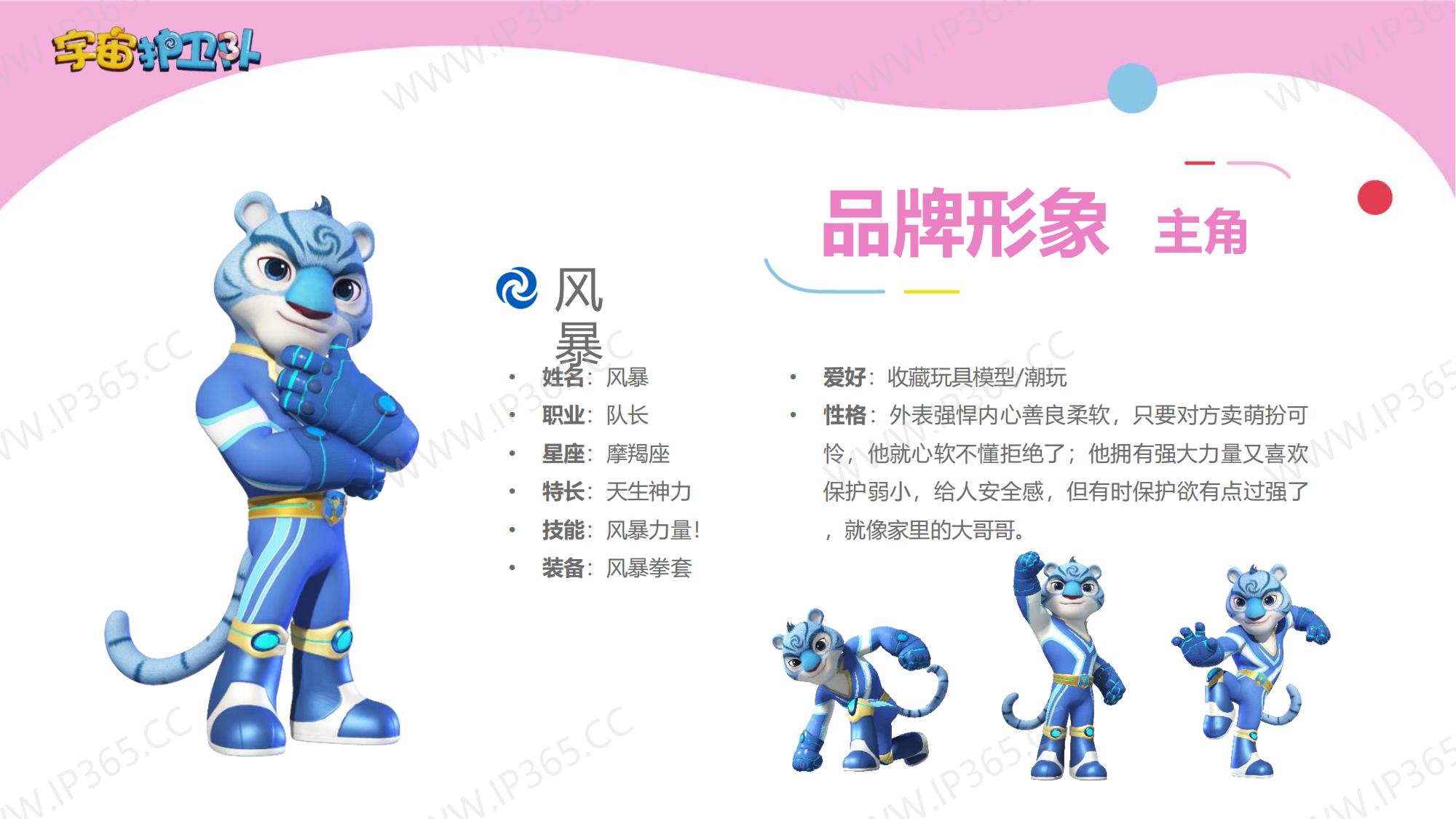 《宇宙护卫队》讲述了生活在地球上的三名护卫队成员——正直勇敢的队长老虎风暴,天生的行动派猴子闪电,知识渊博头脑聪明的兔子彩虹,他们三人相互协作,一同保护地球上的动物居民们的故事。 故事中的主角们各有所长,老虎风暴作为队长是整个团队的精神支柱,有一双力量惊人的“风暴力量”拳套,可以推动沉重的物体,甚至击碎巨大的岩石。猴子闪电天生乐观热情,有一套飞行装备“闪电飞梭”,穿着它可以在世界的任意角落飞速翱翔。兔子彩虹头脑聪明,逻辑严谨,还有一把神奇的“彩虹能量”,发射出的高分子能量罩,能在危险环境中产生安全隔绝的能量力场空间,保护其中的对象。彩虹还发明了一个智能小机器人“小雨点”来协助护卫队执行任务,它就是彩虹的小跟班。 每当有小动物们陷入危险或者需要帮助时,都会向宇宙护卫队呼救。护卫队接到居民们的报警后会立刻出发,执行营救和帮助的任务。每一集他们都会帮助一个小动物,并在执行任务的过程中学会接纳彼此的不同,也会了解到这些动物身上的特征,比如海马是雄性负责“生育”后代,猪的嗅觉比狗灵敏等等。 在一次次的探索和冒险中,宇宙护卫队也能从不同角度审视自我,不断成长。