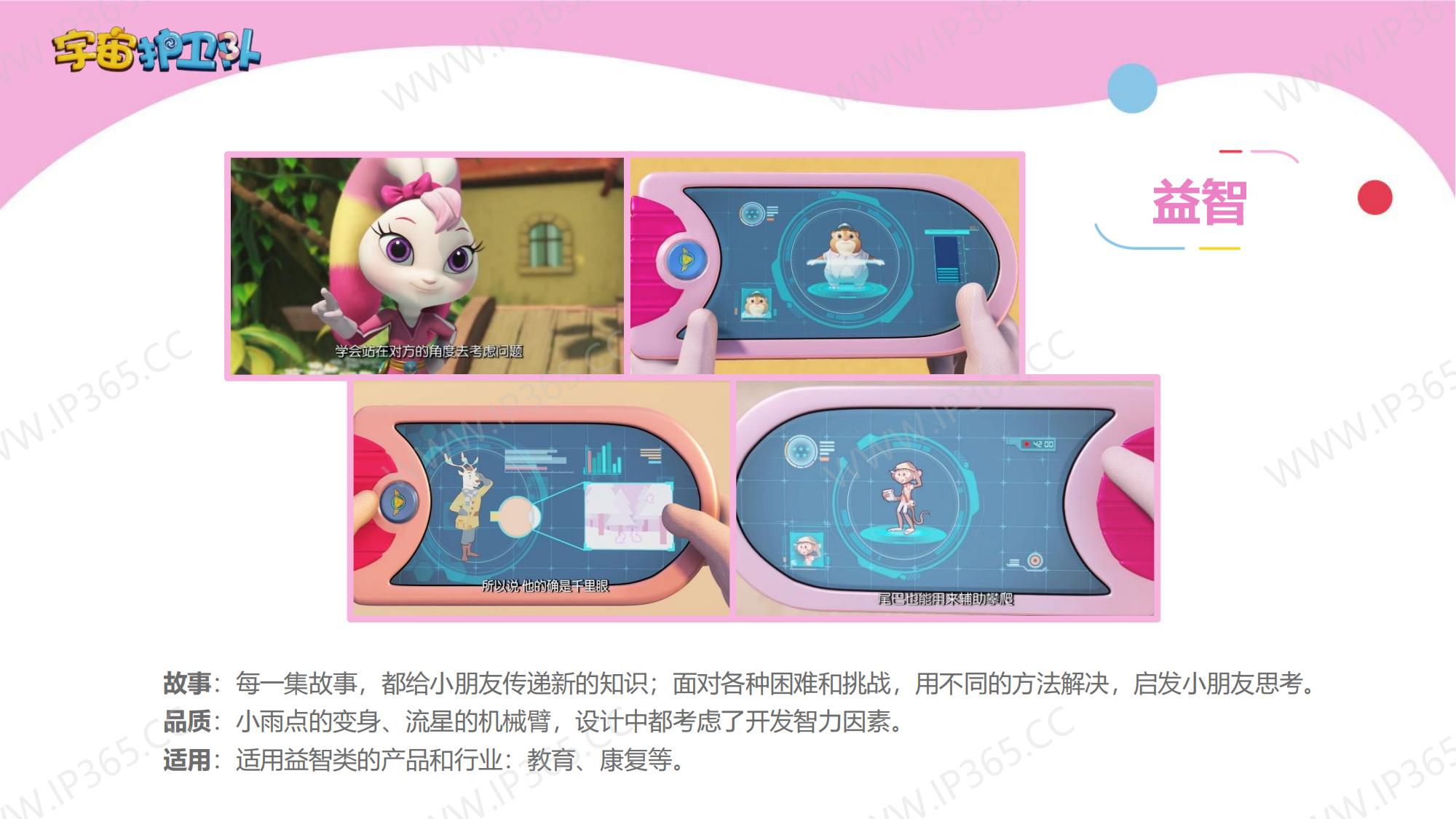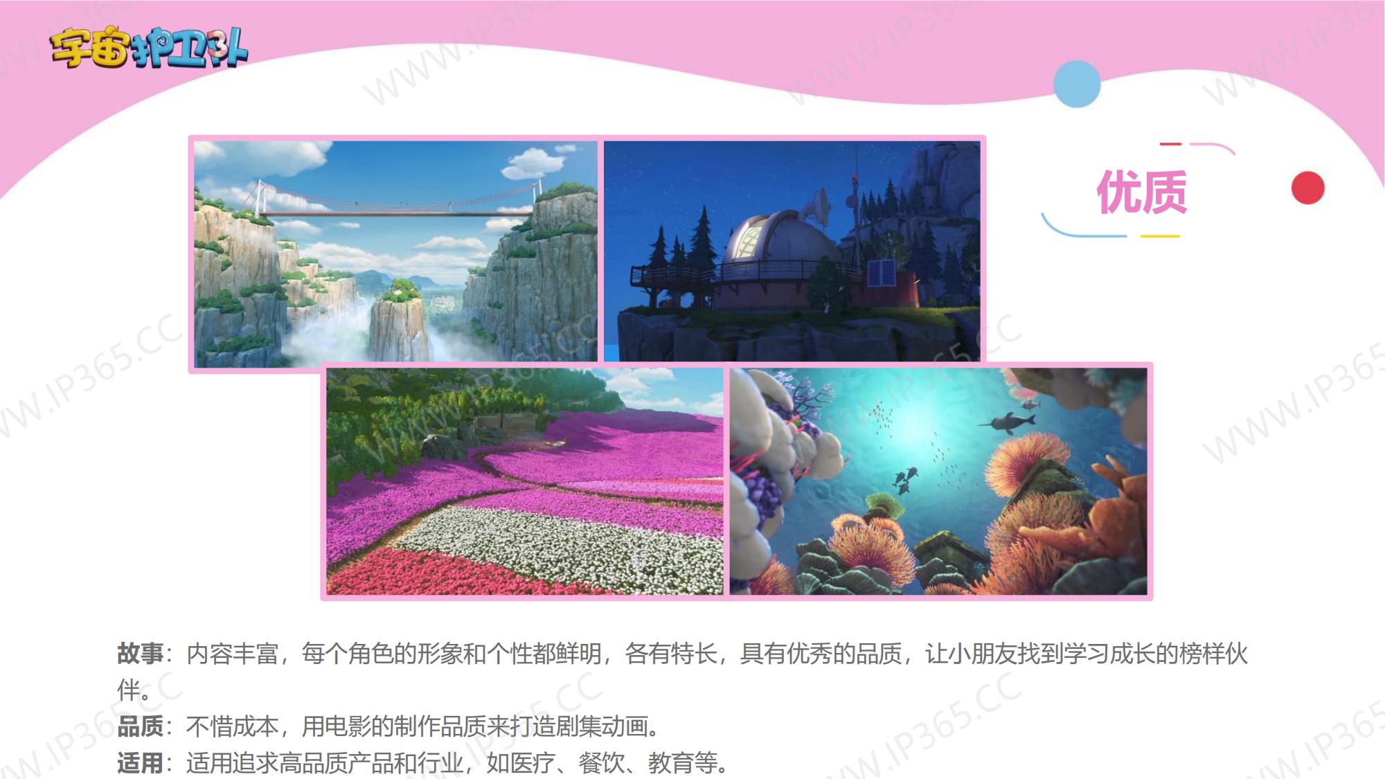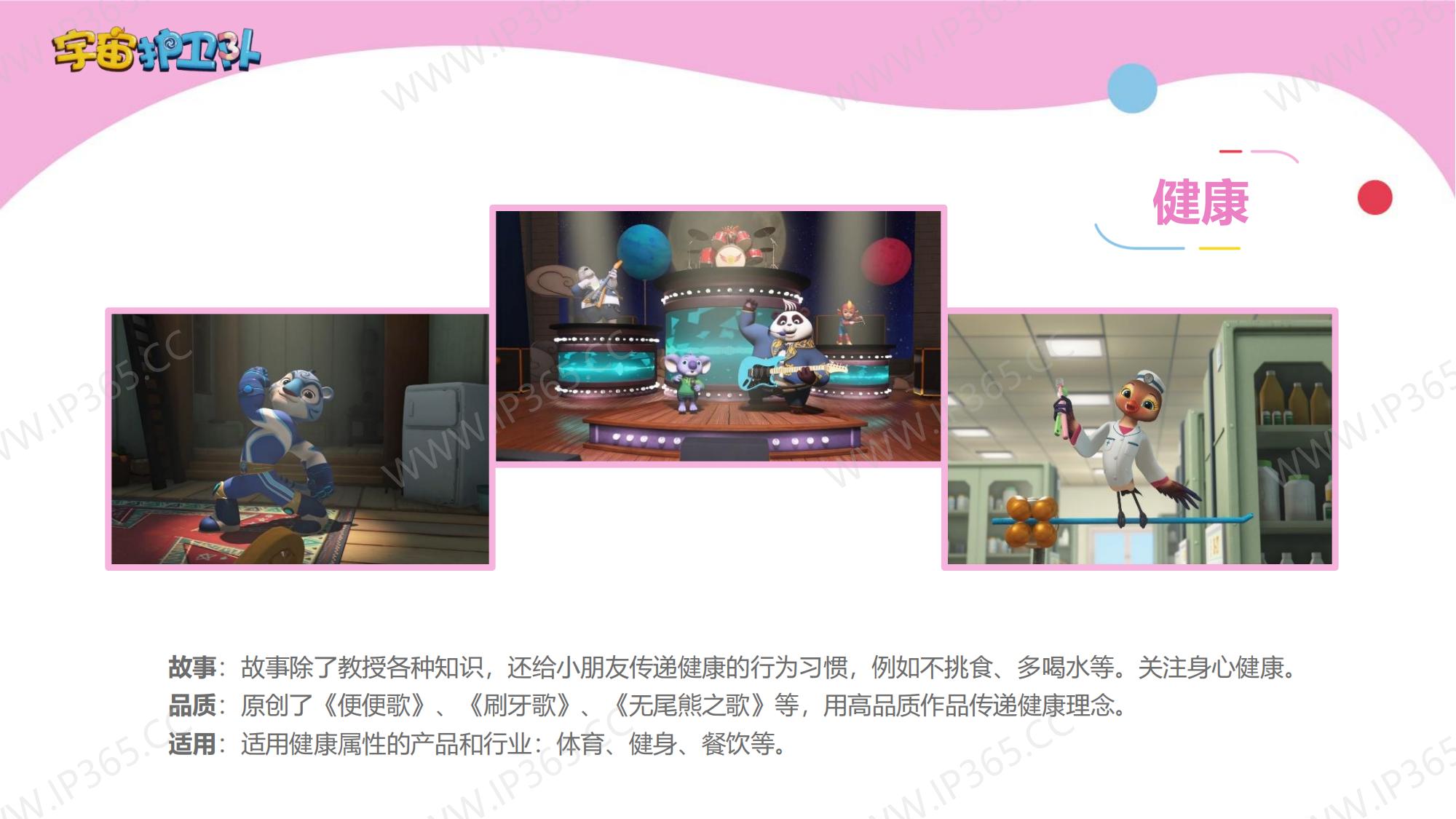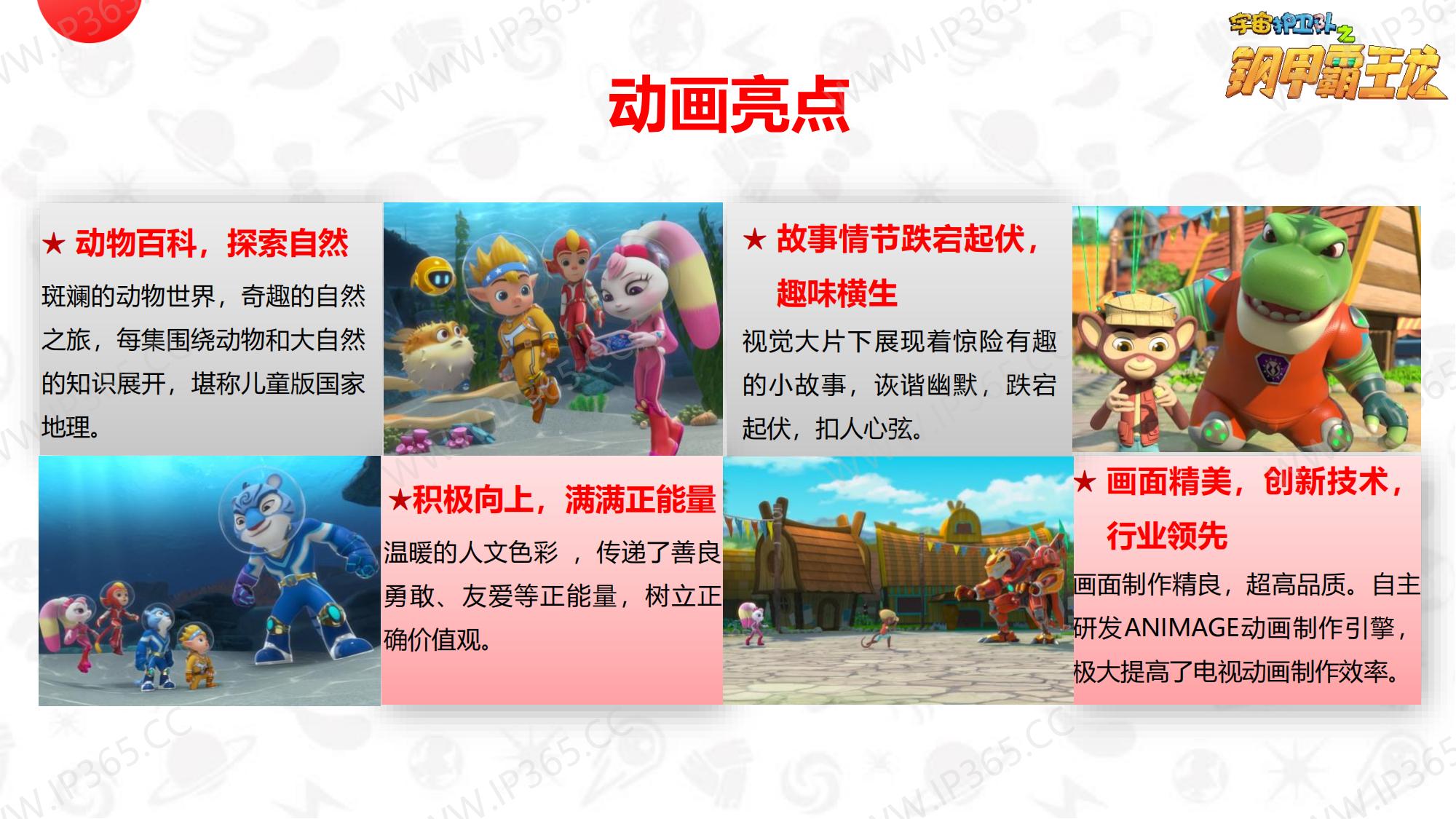 《宇宙护卫队》讲述了生活在地球上的三名护卫队成员——正直勇敢的队长老虎风暴,天生的行动派猴子闪电,知识渊博头脑聪明的兔子彩虹,他们三人相互协作,一同保护地球上的动物居民们的故事。 故事中的主角们各有所长,老虎风暴作为队长是整个团队的精神支柱,有一双力量惊人的“风暴力量”拳套,可以推动沉重的物体,甚至击碎巨大的岩石。猴子闪电天生乐观热情,有一套飞行装备“闪电飞梭”,穿着它可以在世界的任意角落飞速翱翔。兔子彩虹头脑聪明,逻辑严谨,还有一把神奇的“彩虹能量”,发射出的高分子能量罩,能在危险环境中产生安全隔绝的能量力场空间,保护其中的对象。彩虹还发明了一个智能小机器人“小雨点”来协助护卫队执行任务,它就是彩虹的小跟班。 每当有小动物们陷入危险或者需要帮助时,都会向宇宙护卫队呼救。护卫队接到居民们的报警后会立刻出发,执行营救和帮助的任务。每一集他们都会帮助一个小动物,并在执行任务的过程中学会接纳彼此的不同,也会了解到这些动物身上的特征,比如海马是雄性负责“生育”后代,猪的嗅觉比狗灵敏等等。 在一次次的探索和冒险中,宇宙护卫队也能从不同角度审视自我,不断成长。