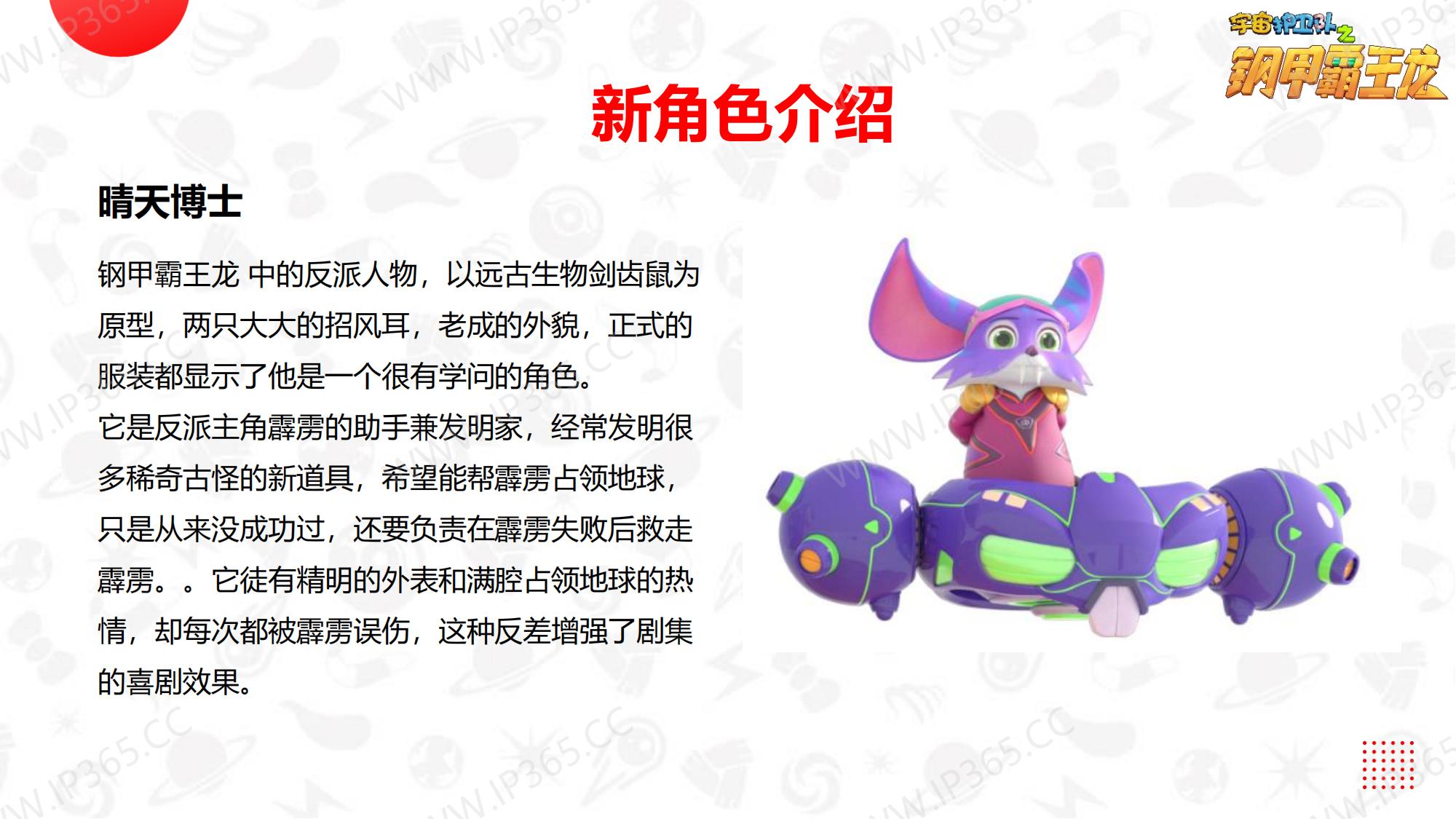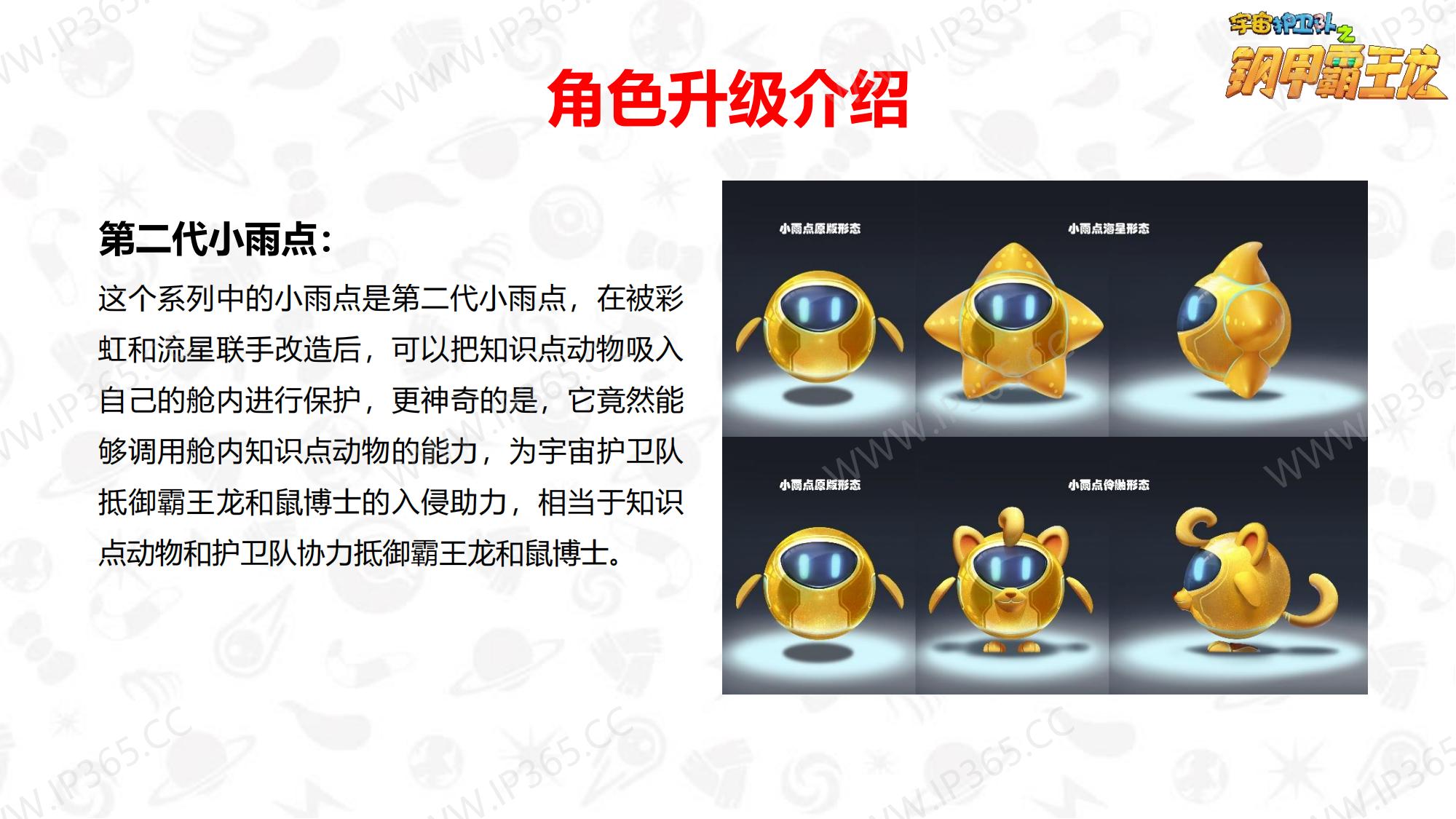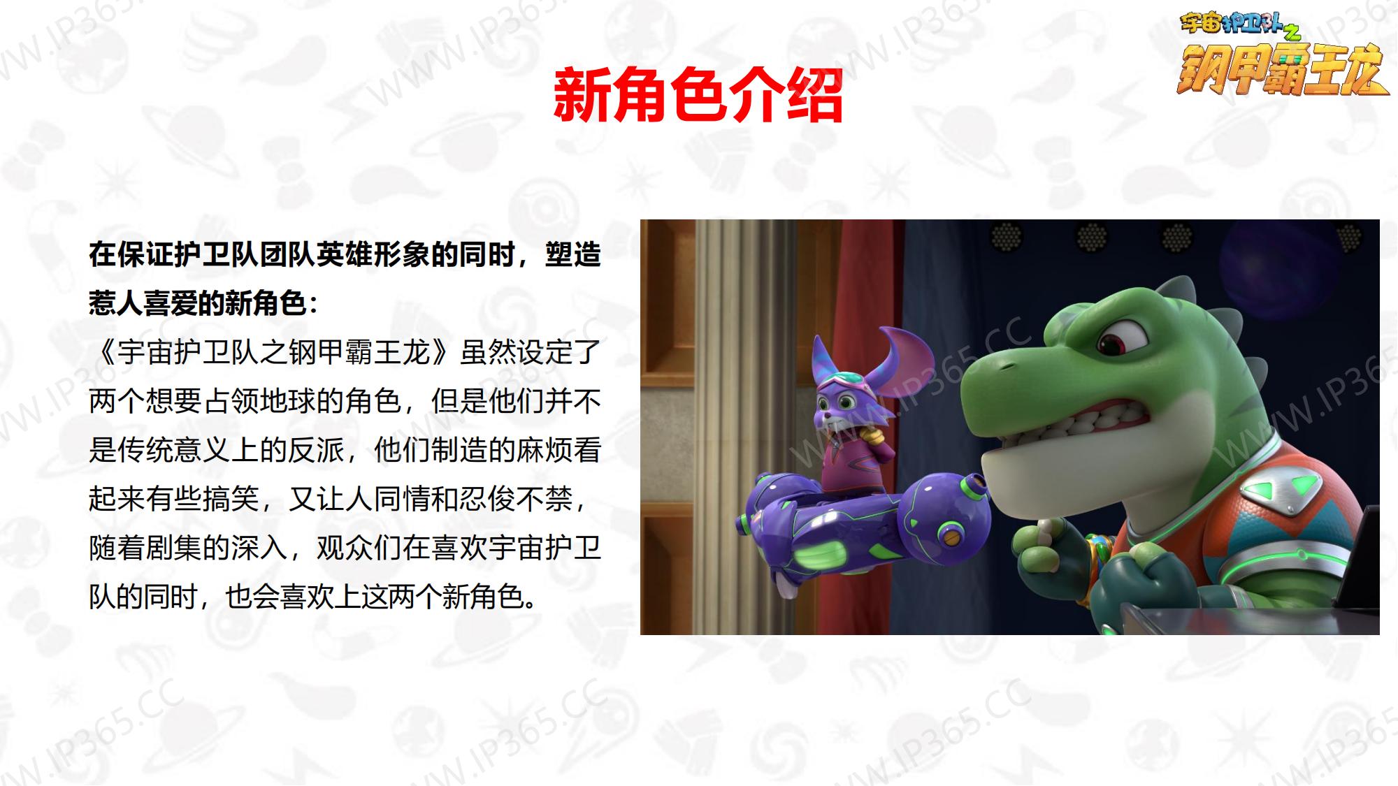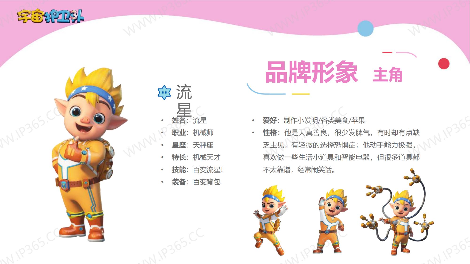 《宇宙护卫队》讲述了生活在地球上的三名护卫队成员——正直勇敢的队长老虎风暴,天生的行动派猴子闪电,知识渊博头脑聪明的兔子彩虹,他们三人相互协作,一同保护地球上的动物居民们的故事。 故事中的主角们各有所长,老虎风暴作为队长是整个团队的精神支柱,有一双力量惊人的“风暴力量”拳套,可以推动沉重的物体,甚至击碎巨大的岩石。猴子闪电天生乐观热情,有一套飞行装备“闪电飞梭”,穿着它可以在世界的任意角落飞速翱翔。兔子彩虹头脑聪明,逻辑严谨,还有一把神奇的“彩虹能量”,发射出的高分子能量罩,能在危险环境中产生安全隔绝的能量力场空间,保护其中的对象。彩虹还发明了一个智能小机器人“小雨点”来协助护卫队执行任务,它就是彩虹的小跟班。 每当有小动物们陷入危险或者需要帮助时,都会向宇宙护卫队呼救。护卫队接到居民们的报警后会立刻出发,执行营救和帮助的任务。每一集他们都会帮助一个小动物,并在执行任务的过程中学会接纳彼此的不同,也会了解到这些动物身上的特征,比如海马是雄性负责“生育”后代,猪的嗅觉比狗灵敏等等。 在一次次的探索和冒险中,宇宙护卫队也能从不同角度审视自我,不断成长。